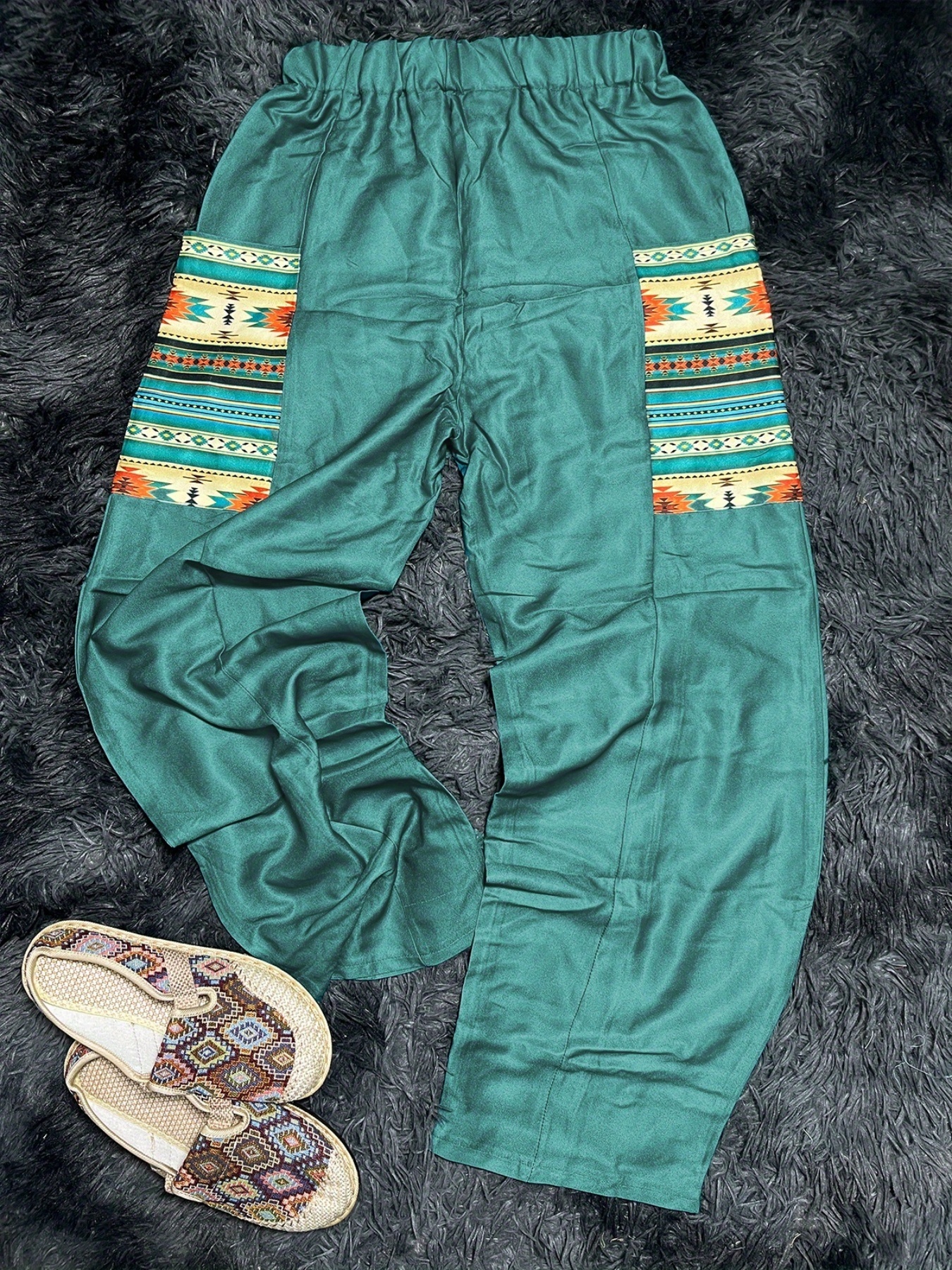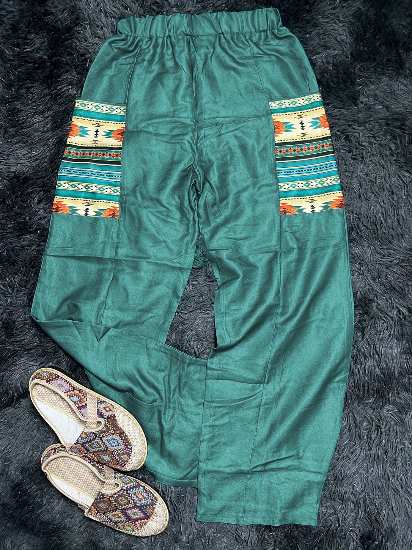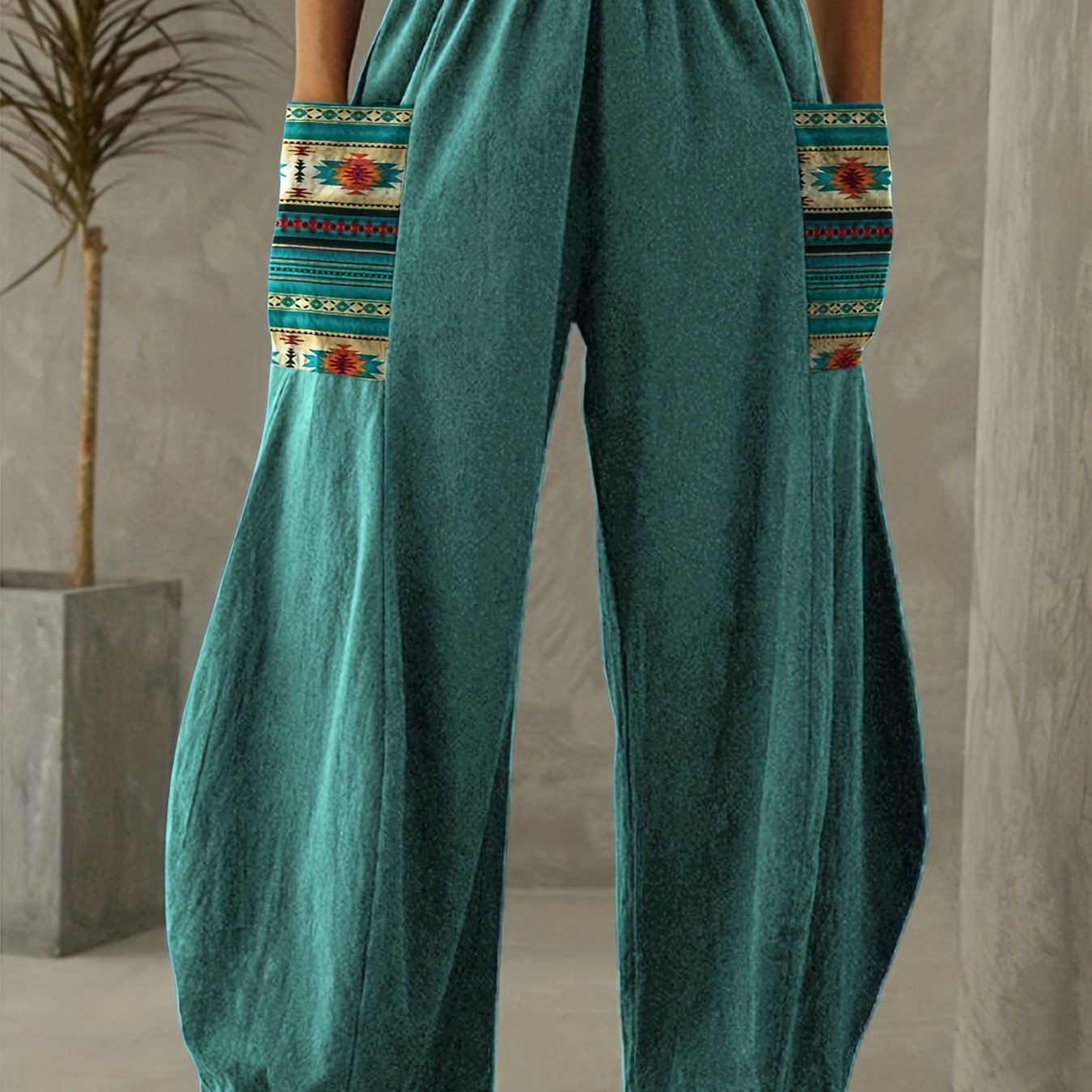 Boho Aztec Print High Waist Pants, Vintage Elastic Wide Leg Pants, Women's Clothing