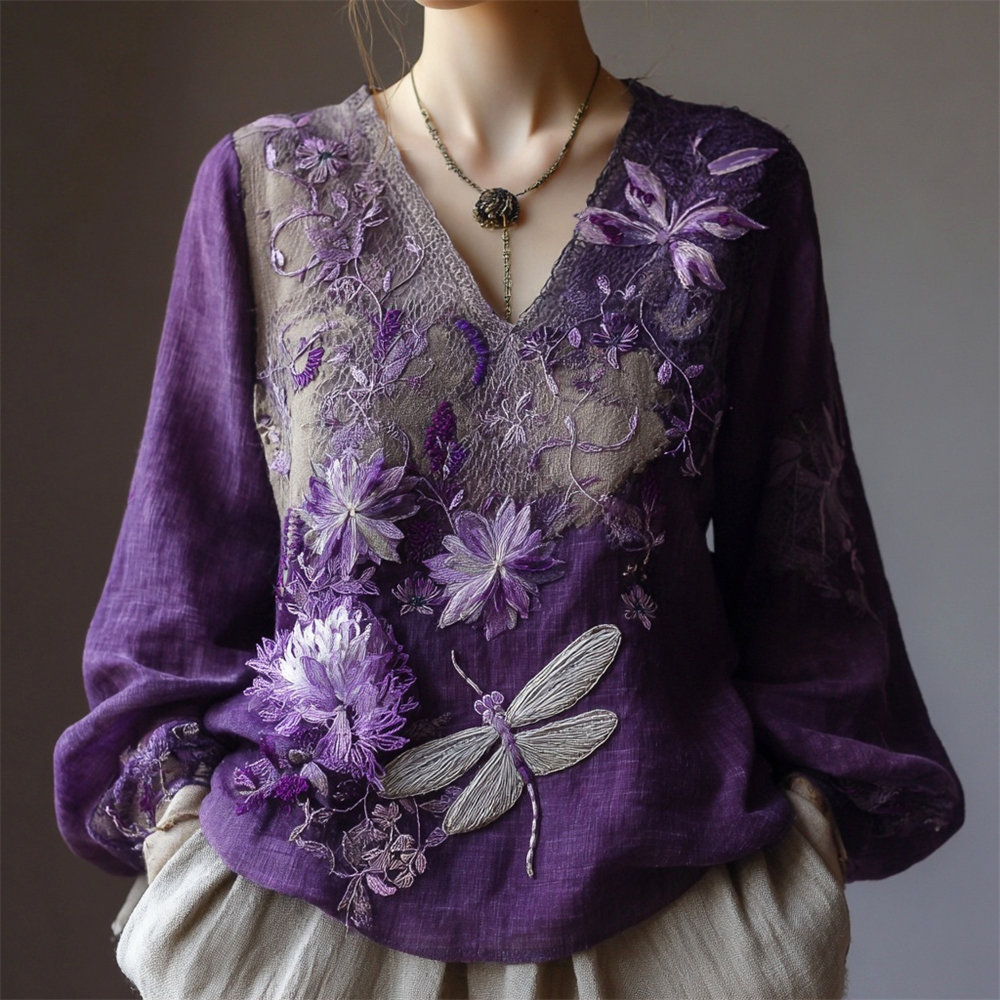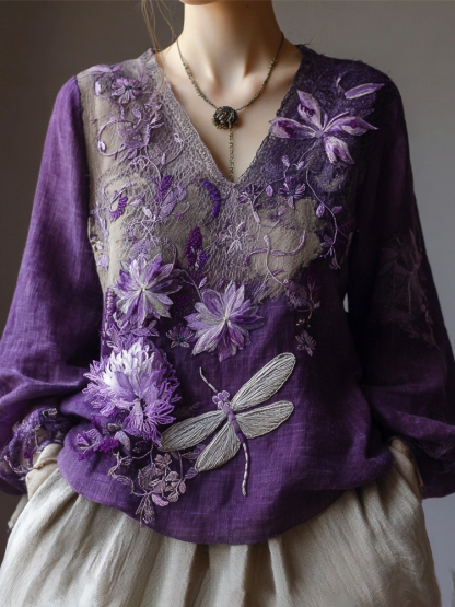 Boho Dragonfly Floral Embroidery Women's V-neck Linen Long Sleeve Shirt