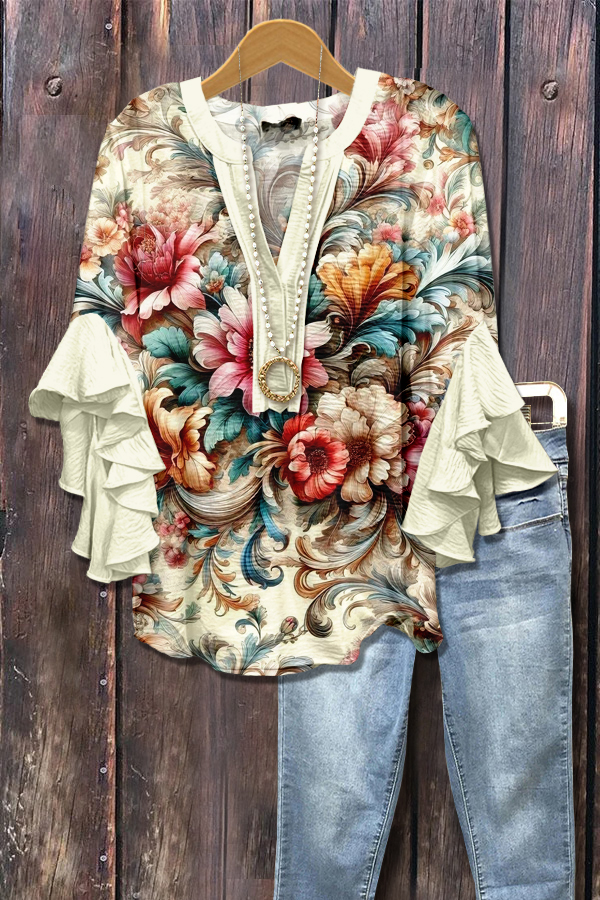Boho Floral Print Ruffle Sleeve Top