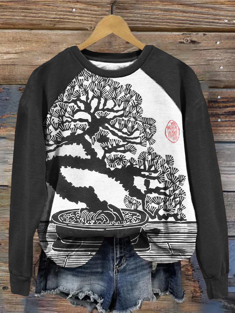 Bonsai Tree Japanese Lino Art Contrast Sleeve Comfy Sweatshirt