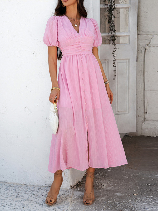 Buttoned Elasticity Pleated Solid Color A-Line High Waisted V-Neck Maxi Dresses