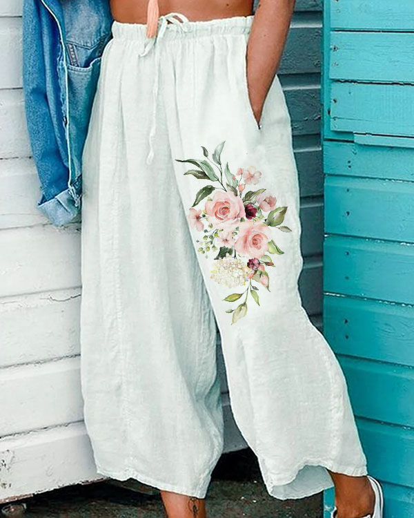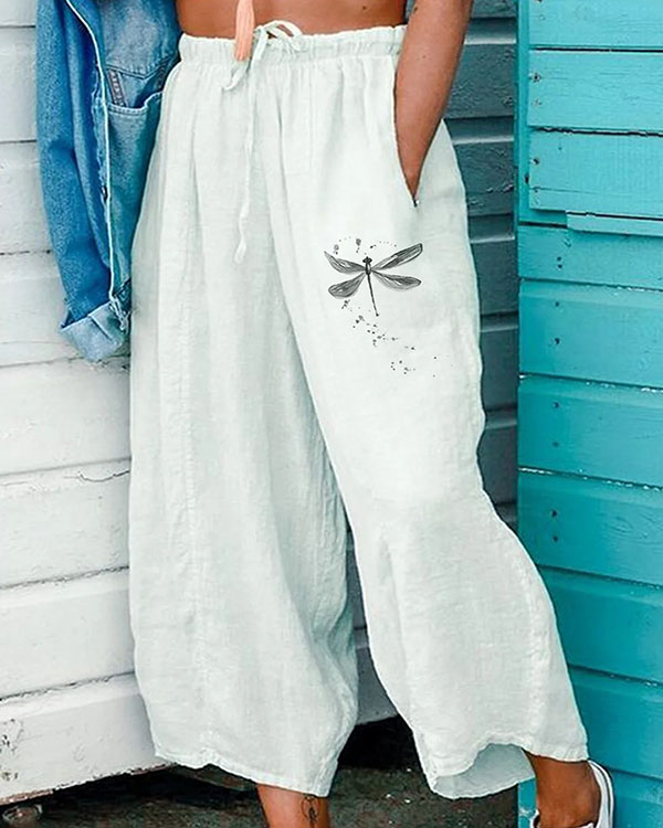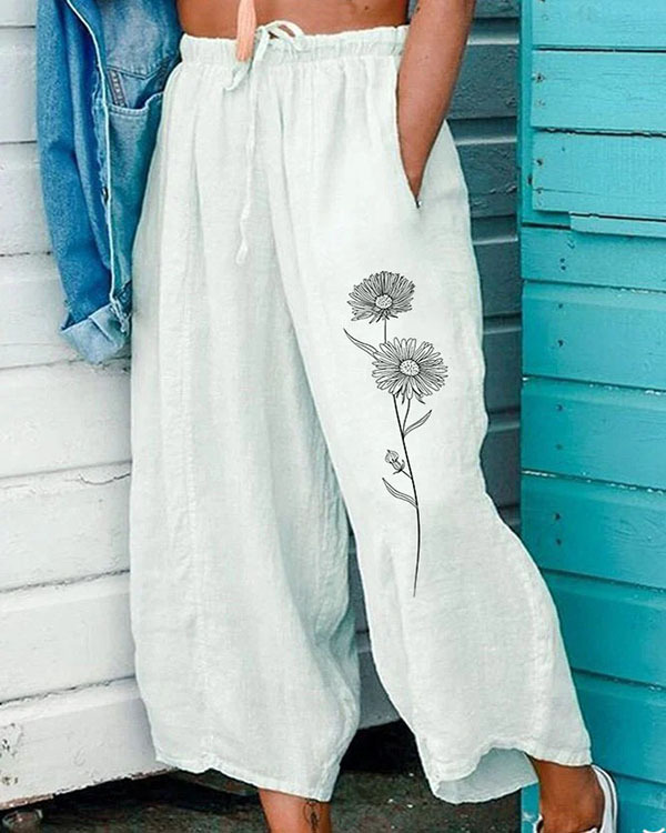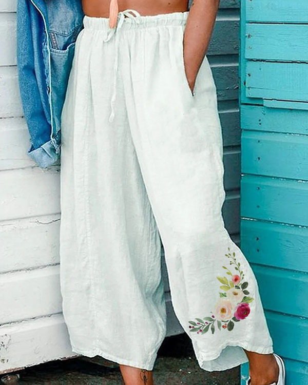 Casual Cotton and Linen Printed Tie Mid-length Loose Pants