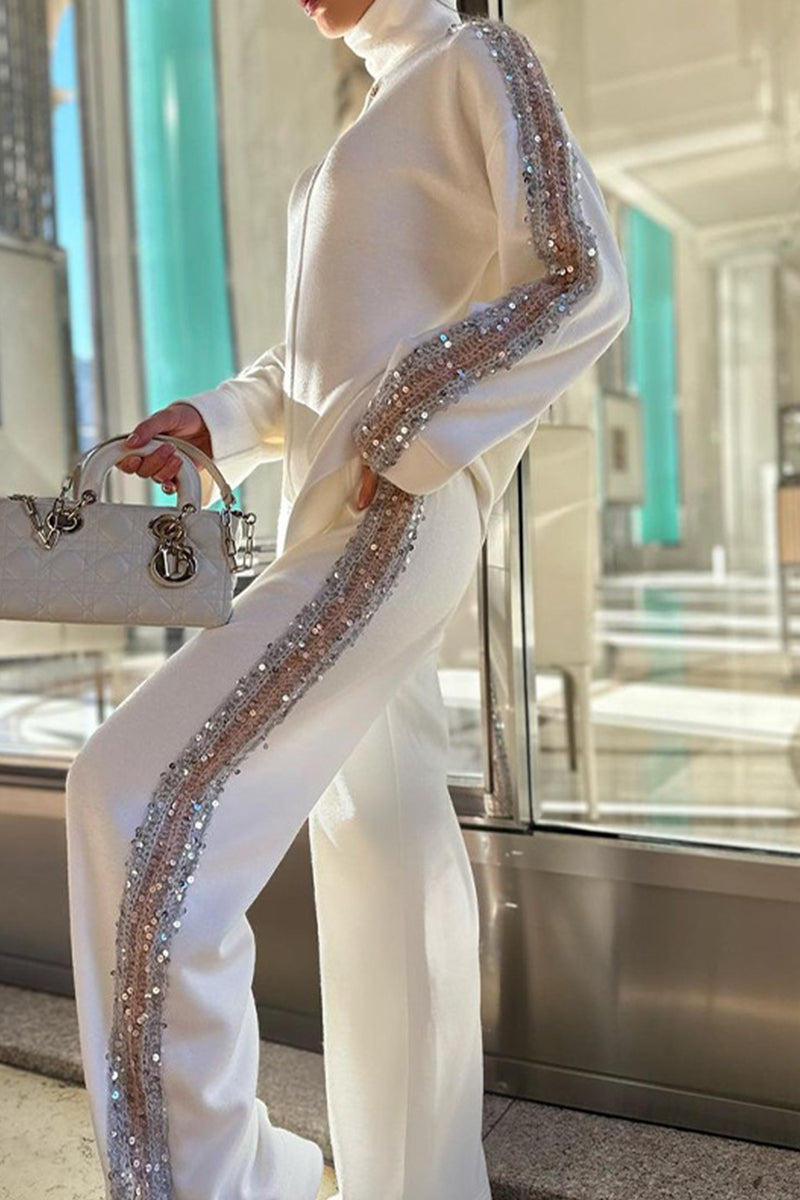 Casual Solid Sequins Turtleneck Long Sleeve Two Pieces
