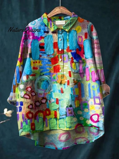 Colorful Abstract Painting Printed Women's Casual Cotton And Linen Shirt
