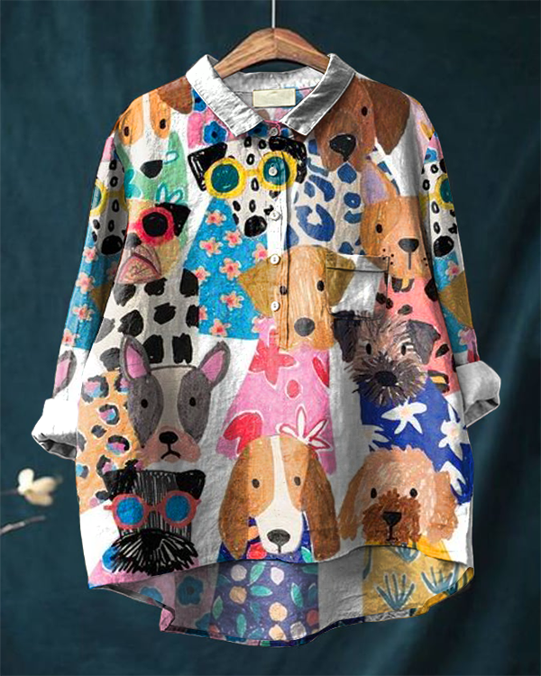Colorful Fun Cartoon Puppy Print Casual Cotton and Linen Shirt