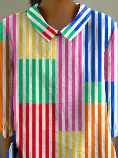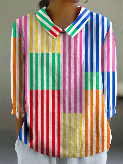 Colorful Geometric Strip Pattern Printed Women's Casual Cotton And Linen 3/4 Sleeve Shirt