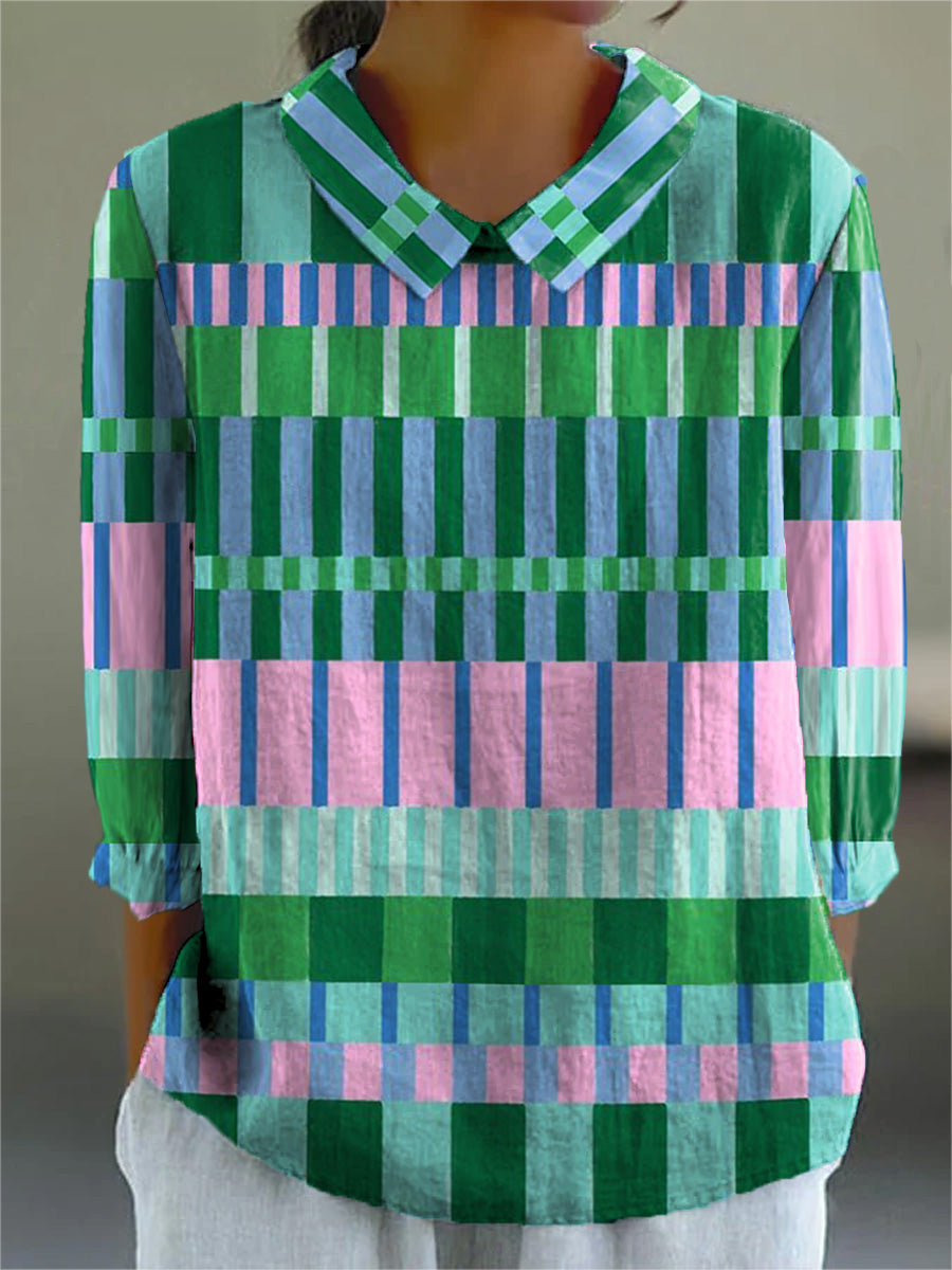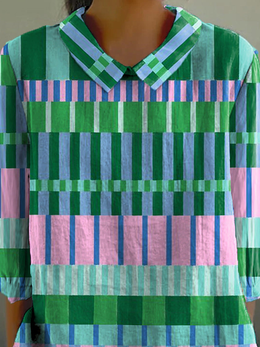 Colorful Summer Geometric Pattern Printed Women's Casual Cotton And Linen 3/4 Sleeve Shirt