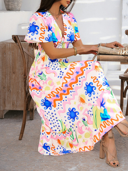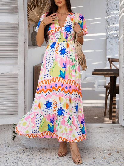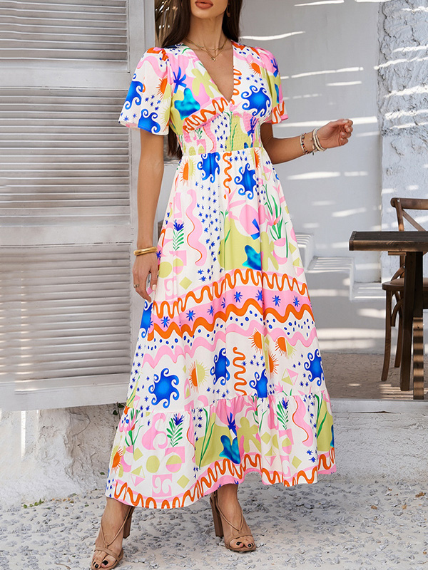 Contrast Color Elasticity A-line High Waisted V-neck Maxi Dresses