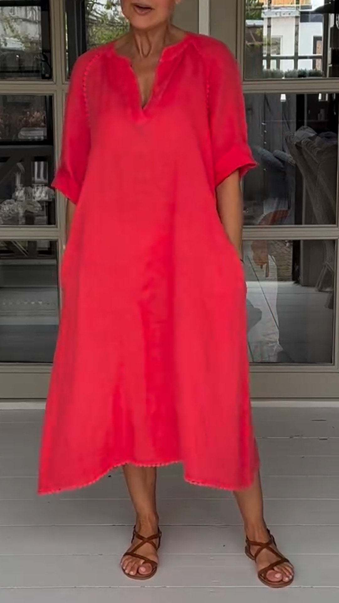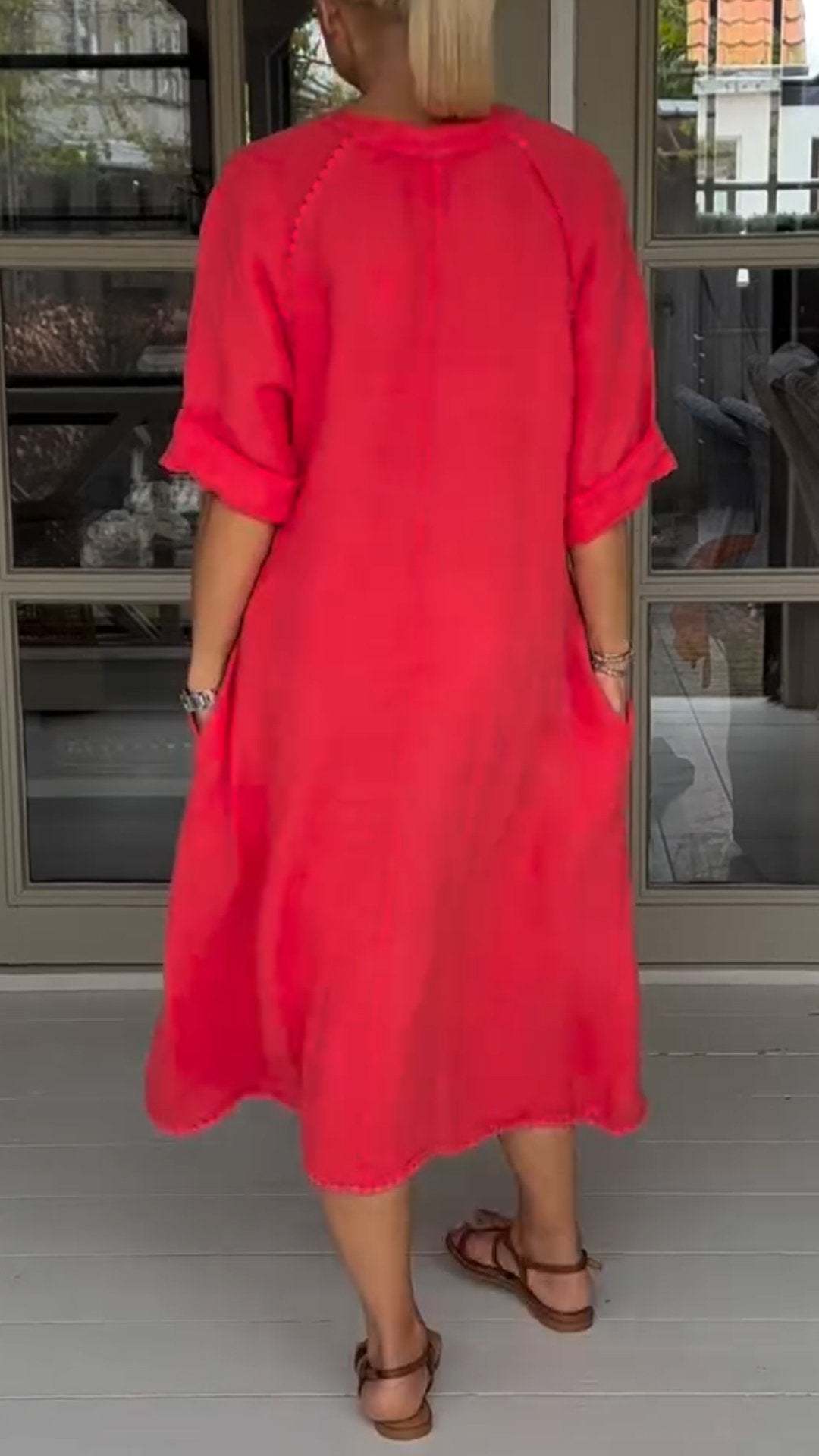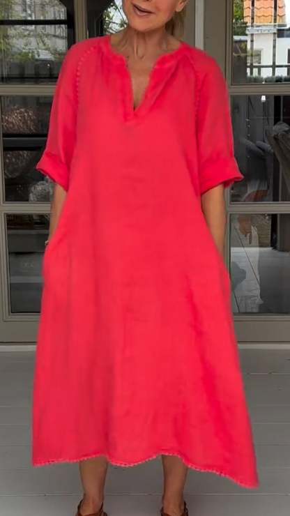 Cotton and Linen V-neck Mid-sleeve Casual Dress
