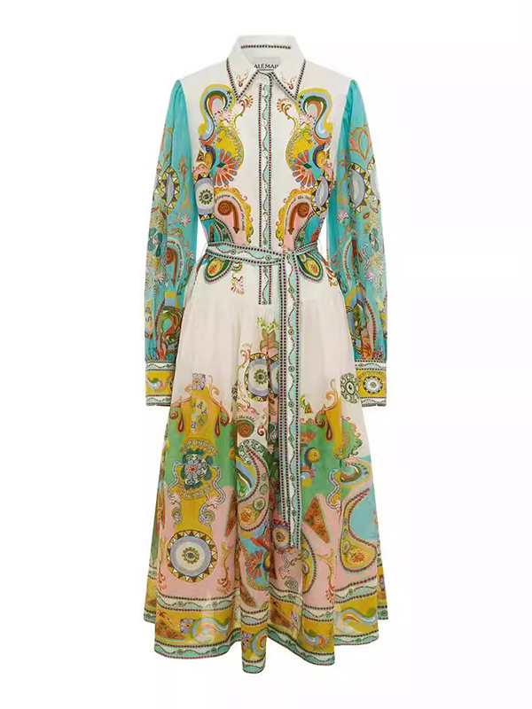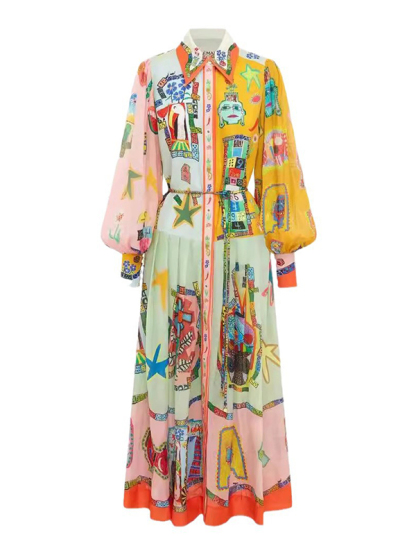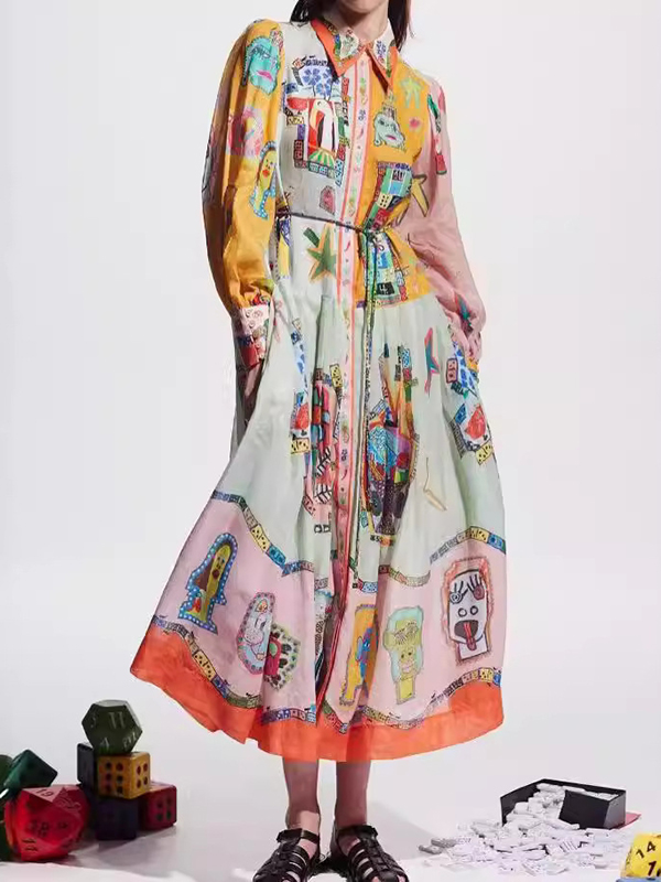Flower Print Patchwork Lapel Collar Maxi Dresses