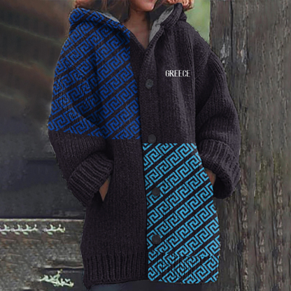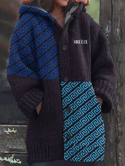 Greek Key Contrasting Color Cozy Hooded Knit Sweater Cardigan