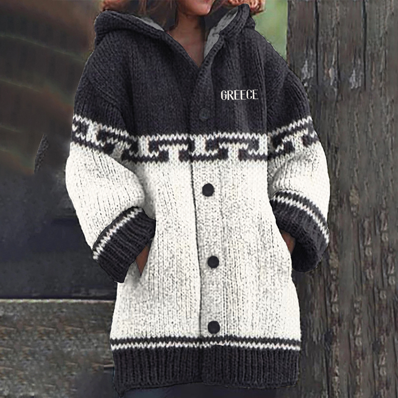 Greek Key Contrasting Color Cozy Knitted Hooded Sweater Cardigan