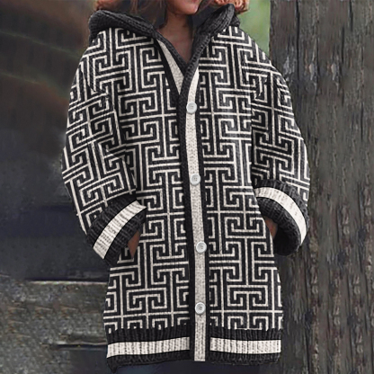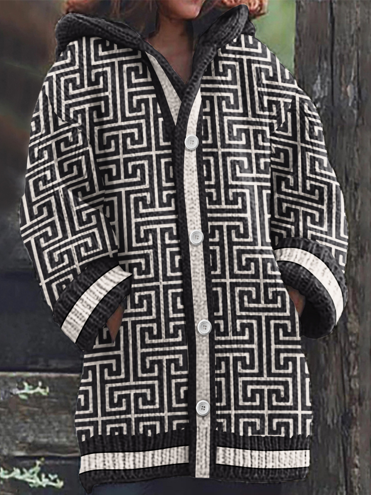 Greek Key Cozy Hooded Knit Sweater Cardigan