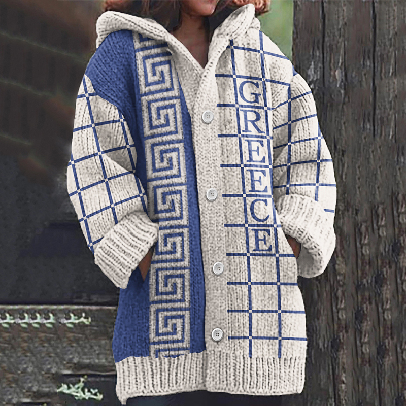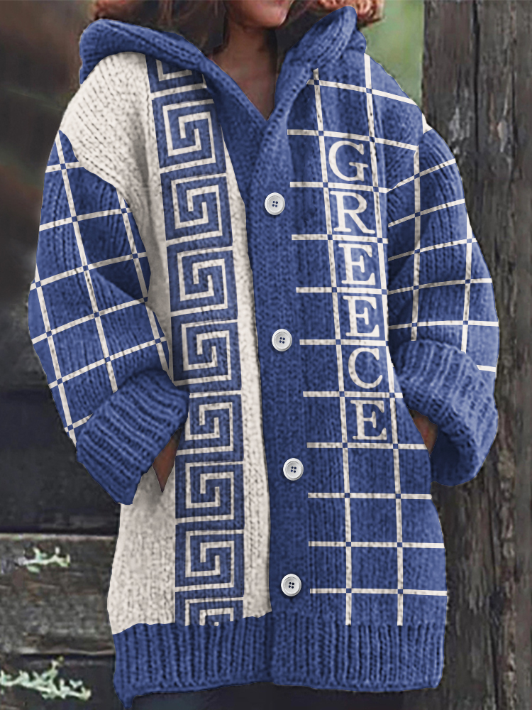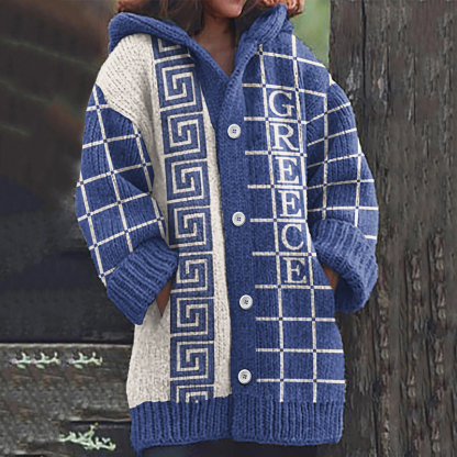 Greek Key Pattern Cozy Hooded Knit Cardigan
