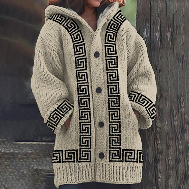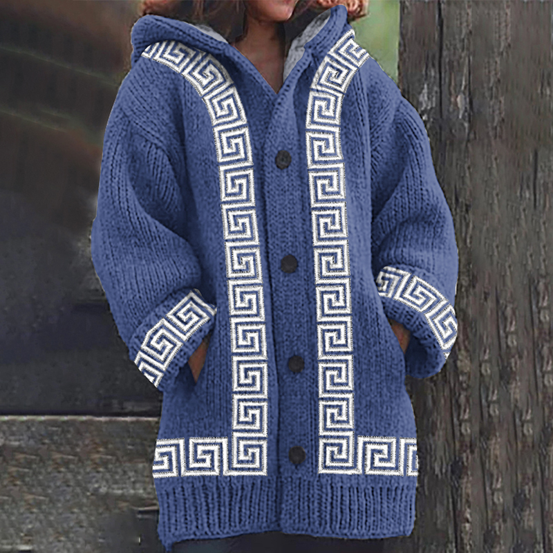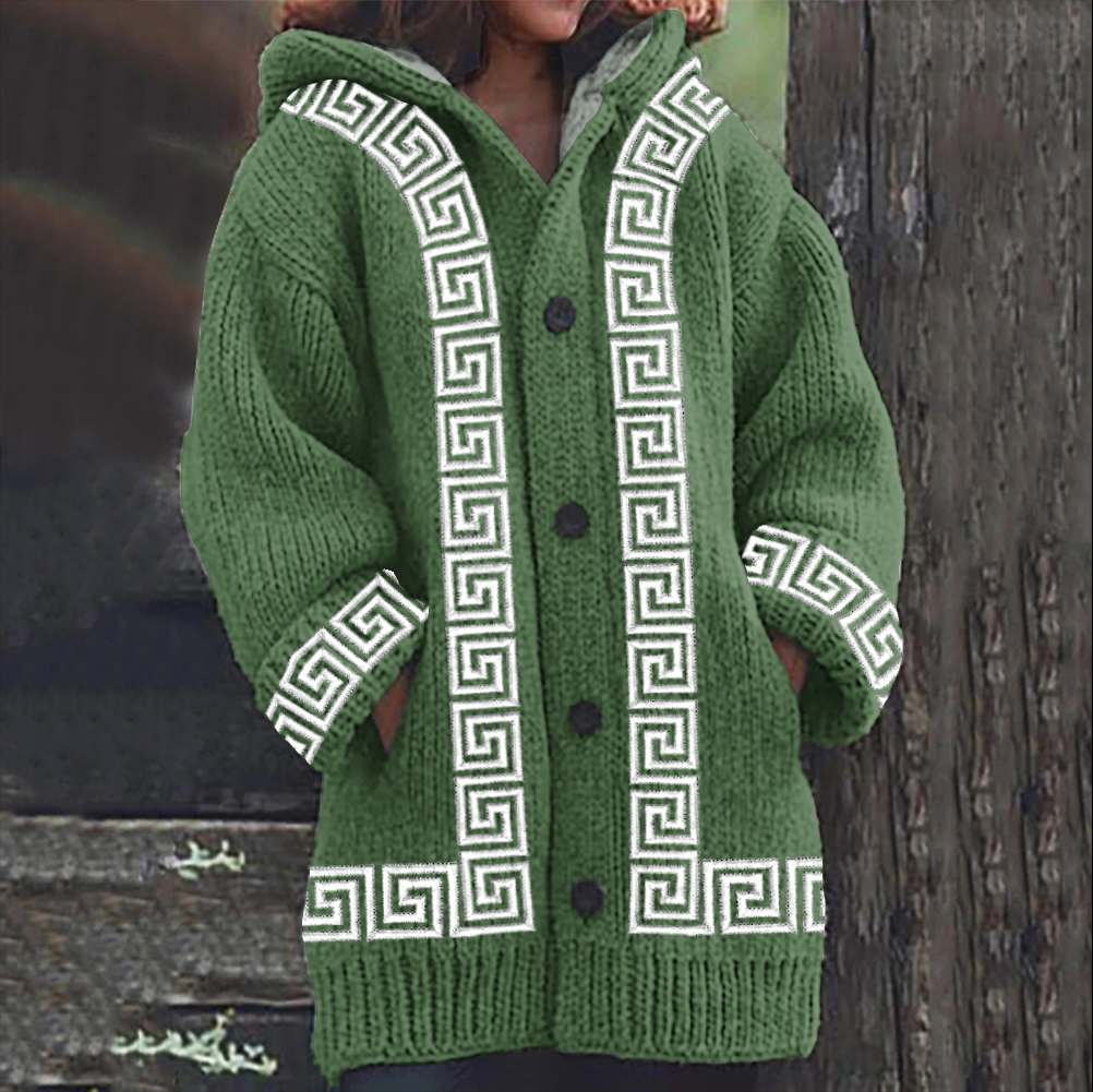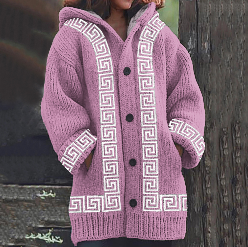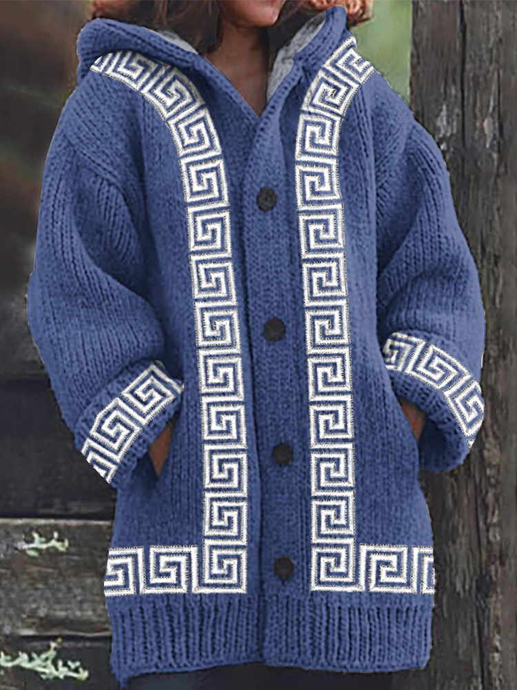 Greek Key Pattern Knit Hooded Cardigan