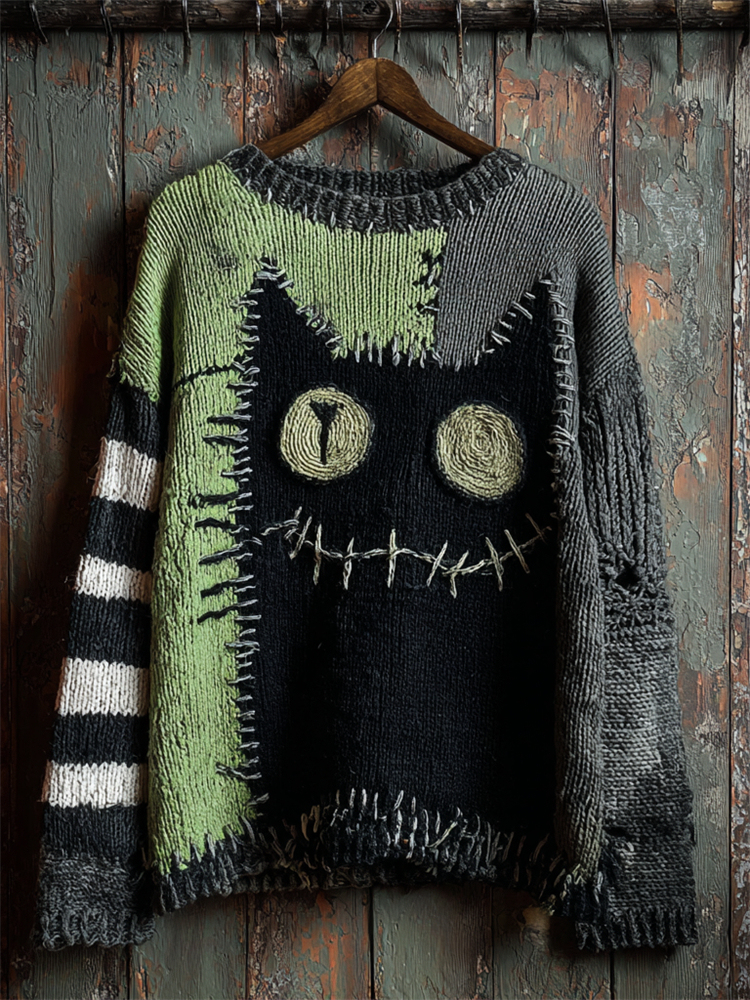 Halloween Black Cat Stitched Contrast Patchwork Cozy Knit Sweater