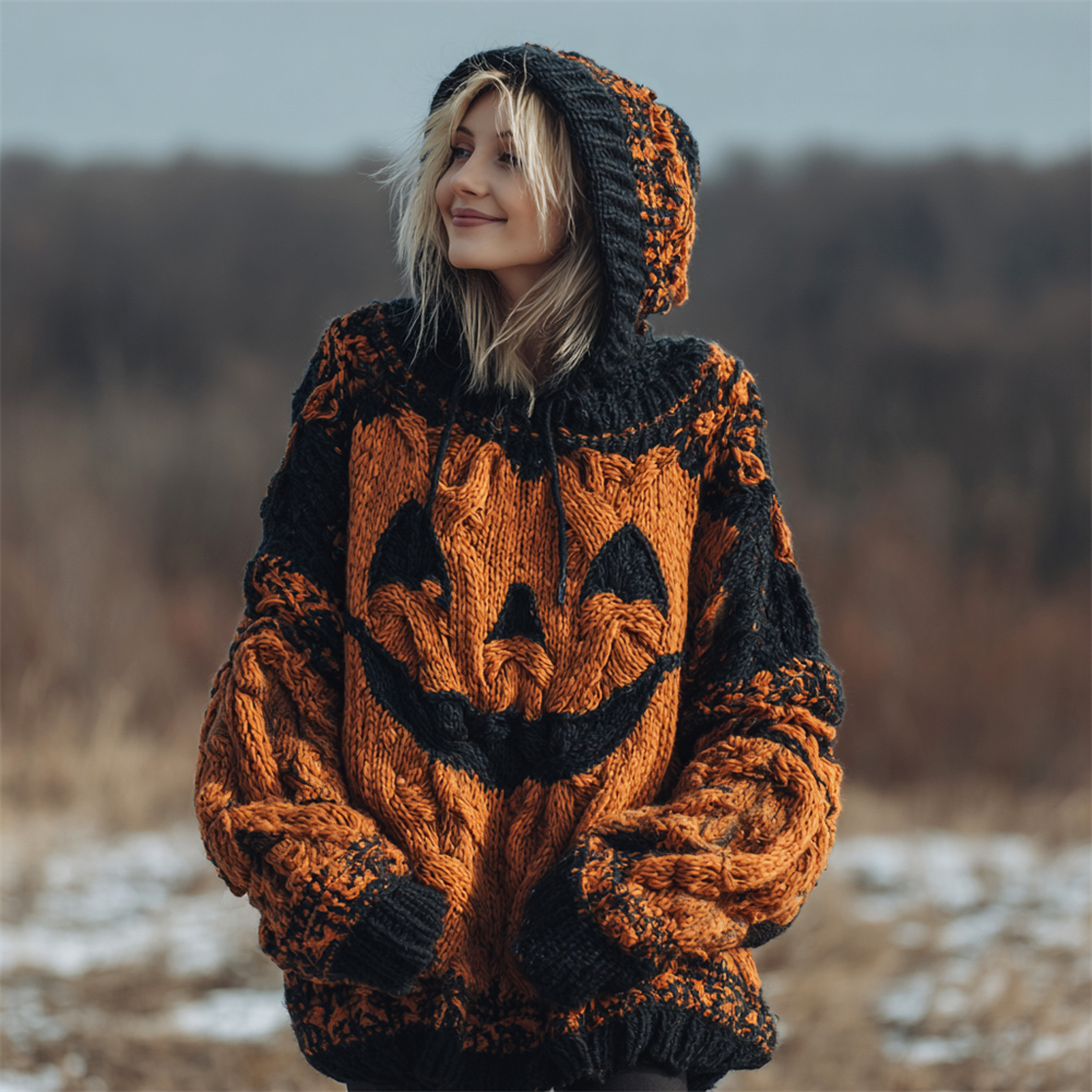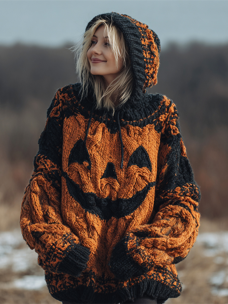 Halloween Spooky Pumpkin Women's Chunky Knit Hooded Sweater