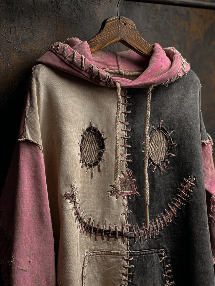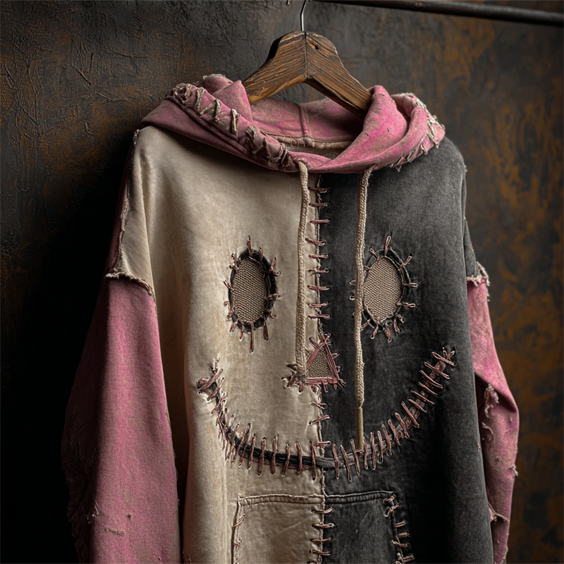 Halloween Stitched Face Contrast Patchwork Washed Hoodie