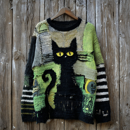 Halloween Witch Black Cat Striped Patchwork Cozy Knit Sweater