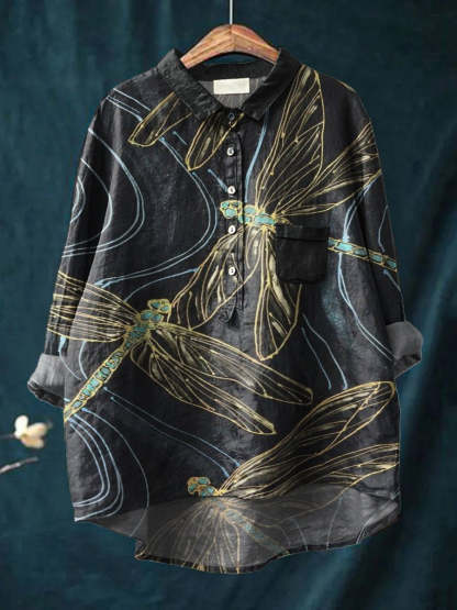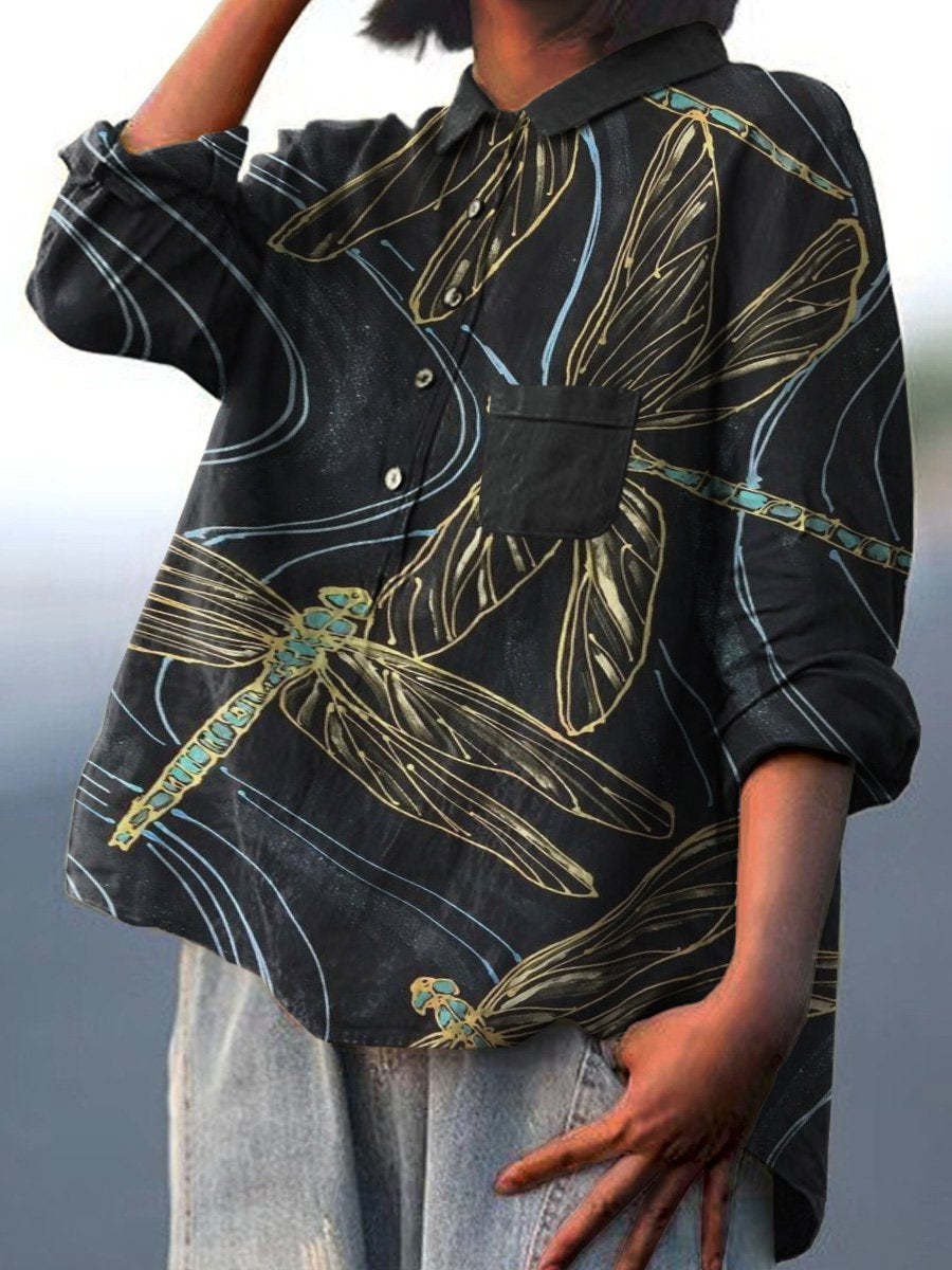 Line Drawing Dragonfly Decorative Pattern Casual Cotton And Linen Shirt