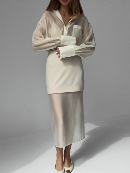 Loose Solid Color See-Through Long Sleeves Lapel Blouse + Skirt Two Pieces Set