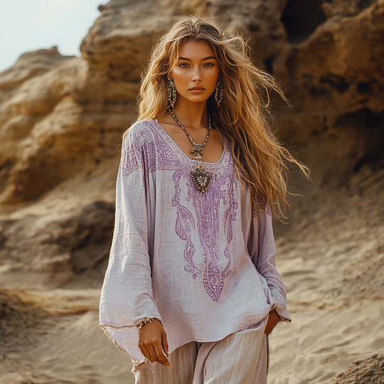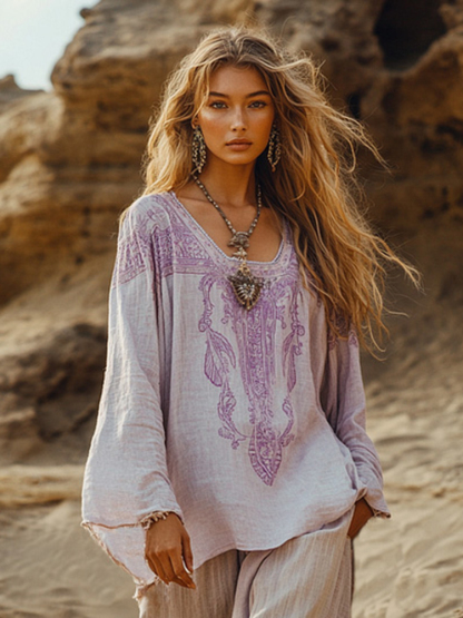 Retro Holiday Bohemian Art Holiday Print Cotton And Linen Blend Loose Blouse