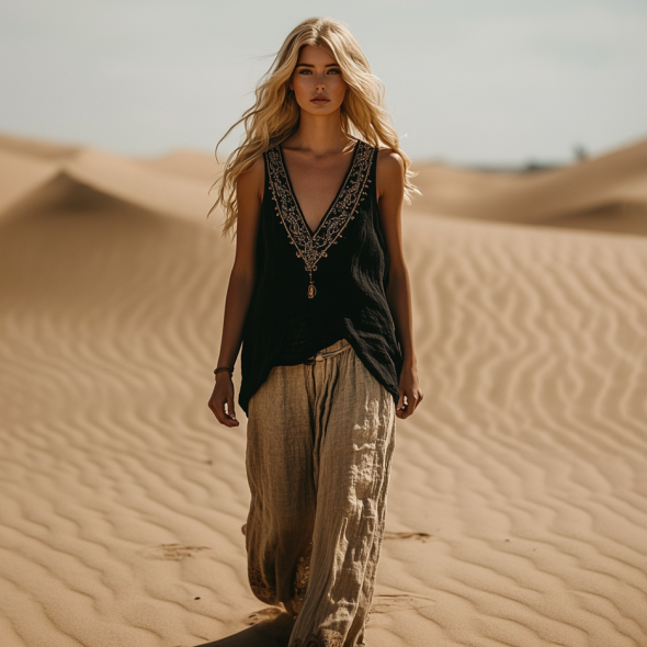 Women's Bohemia Ethnic Linen V-neek Sleeveless Top