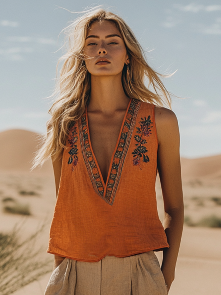 Women's Floral Bohemia Ethnic Style Linen V-neek Sleeveless Top