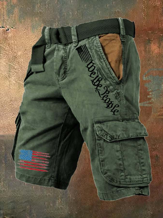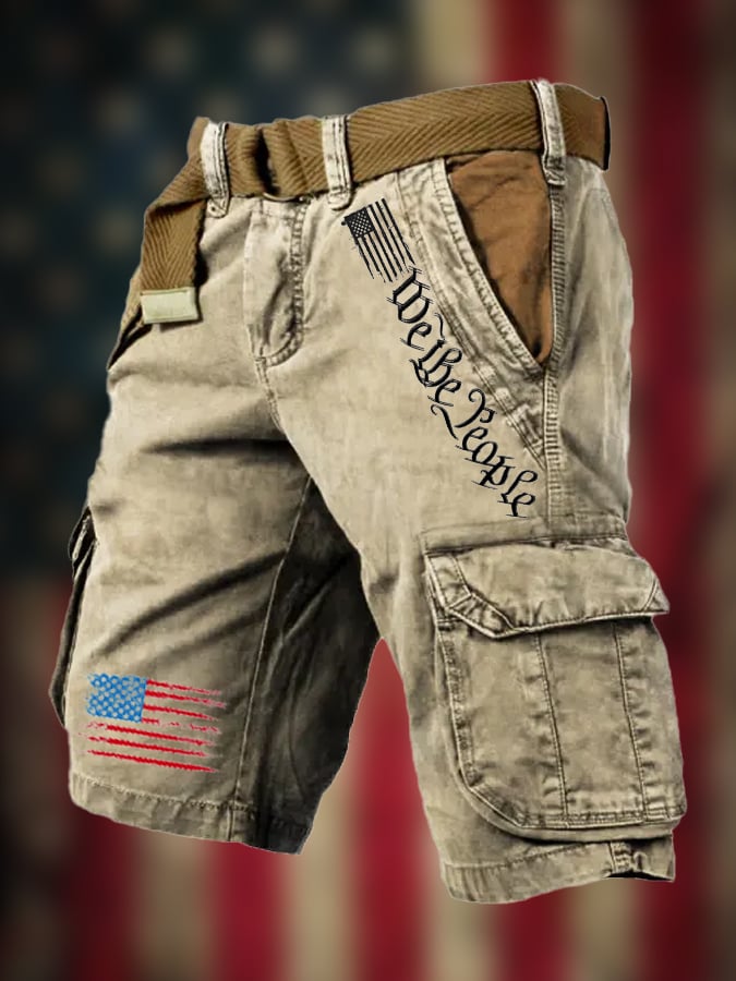 Men's Vintage Flag Independence Day Multi-Pocket Print Cargo Shorts (Belt Not Included)