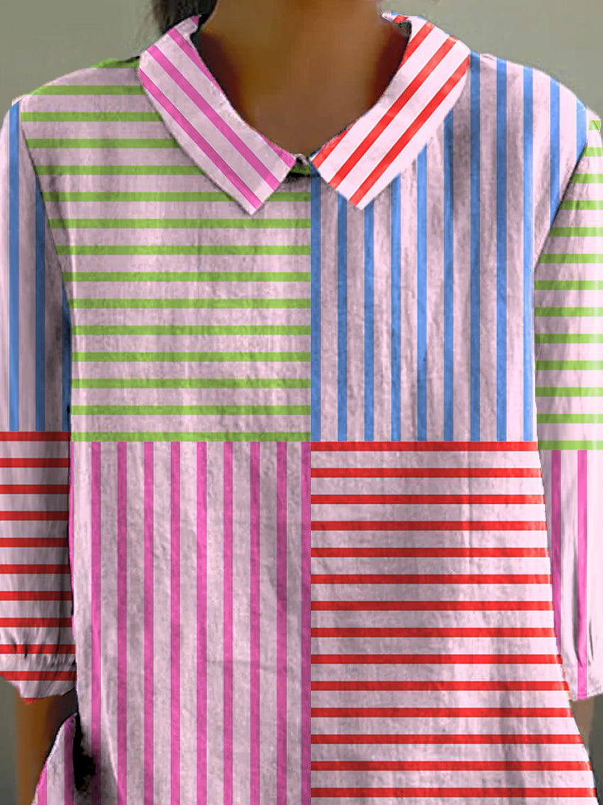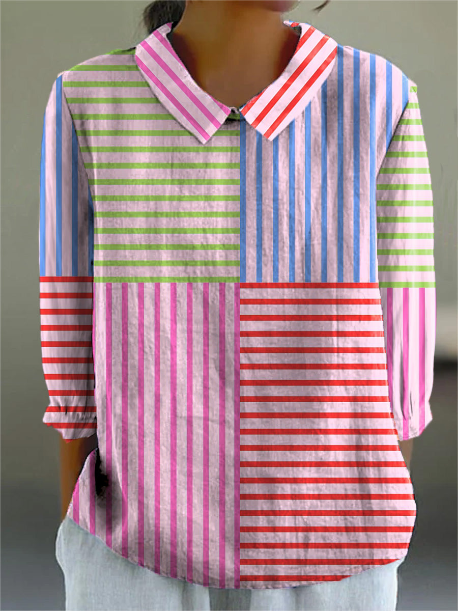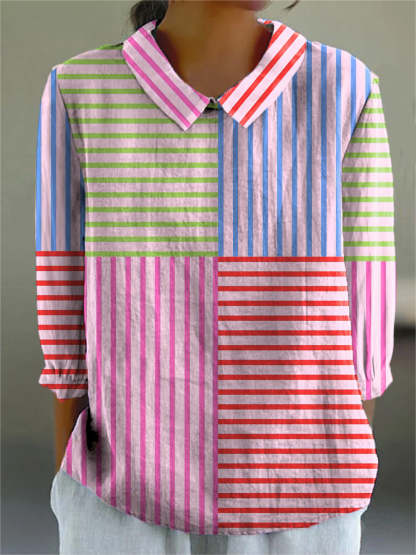 Multicolor Geometric Strip Pattern Printed Women's Casual Cotton And Linen 3/4 Sleeve Shirt