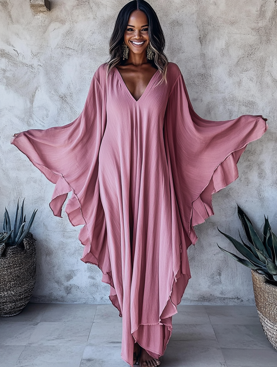 Pink Cotton Linen V-neck Long Kaftan