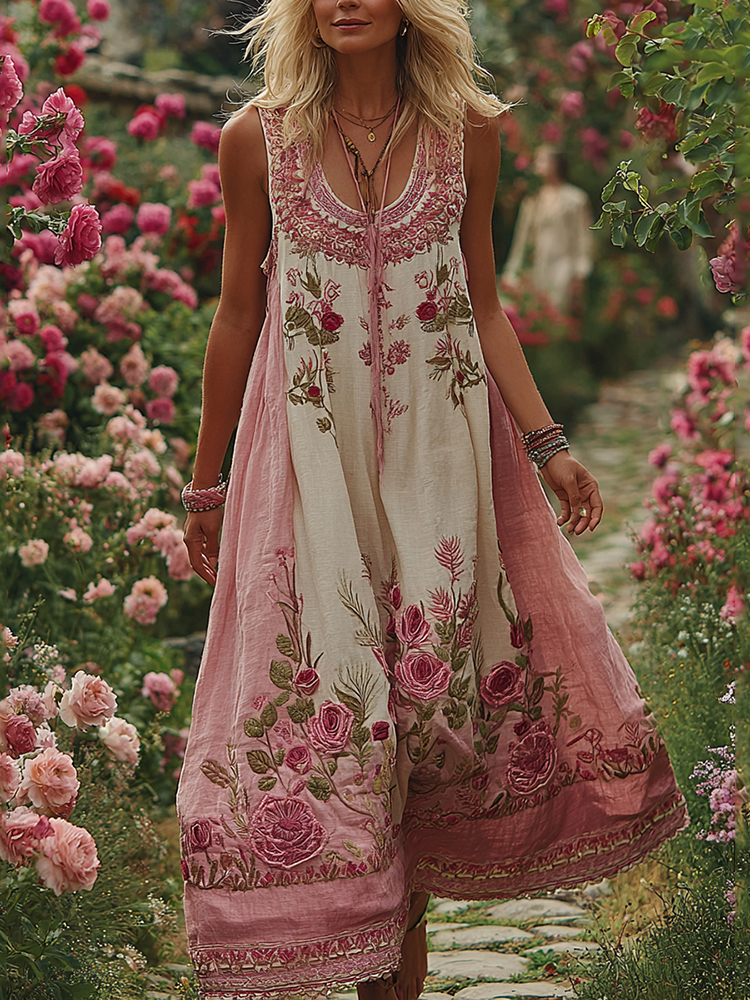 Pink Floral Embroidered Cozy Linen Tank Maxi Dress