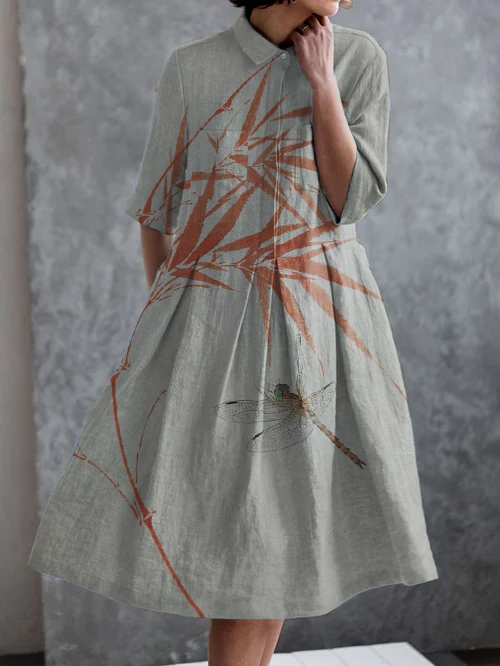 Retro Bamboo Dragonfly Print Casual Pocket Half Sleeve Dress