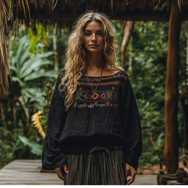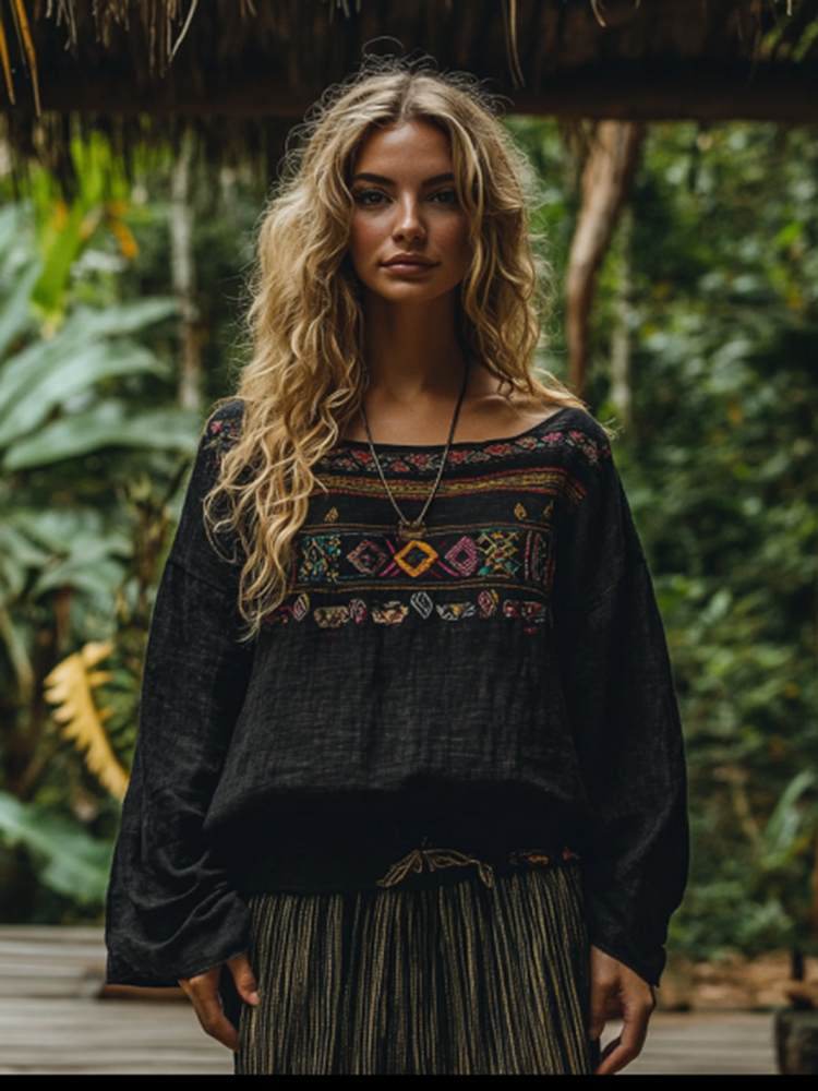 Retro Boho Tribal Art Embroidery Print Cotton And Linen Blend Loose Blouse