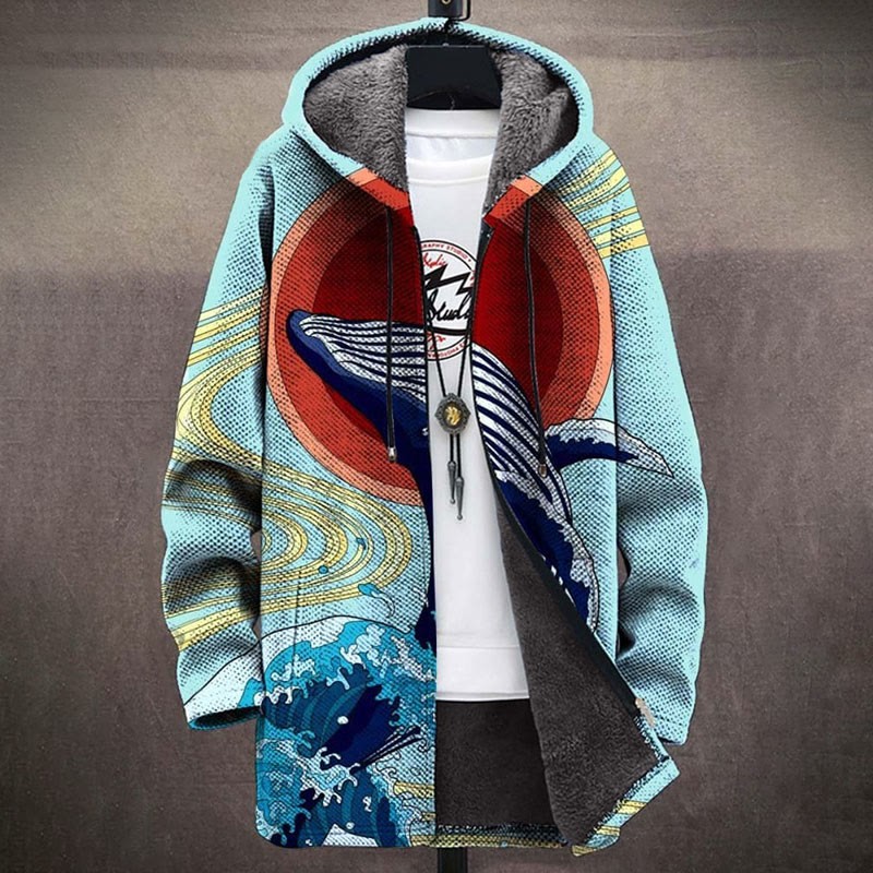 Retro Japanese Asahi Wave Whale Print Unisex Plush Thick Long-sleeved Fleece Jacket