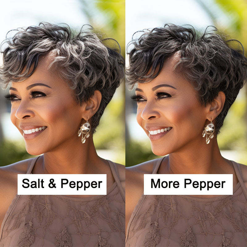 Salt & Pepper Color Custom Edgy Pixie Cuts Wig With Natural Wave Bangs Glueless Hair Wigs For Mom