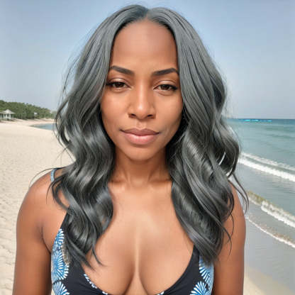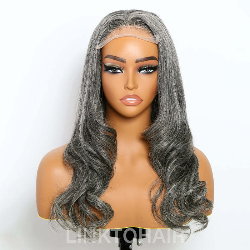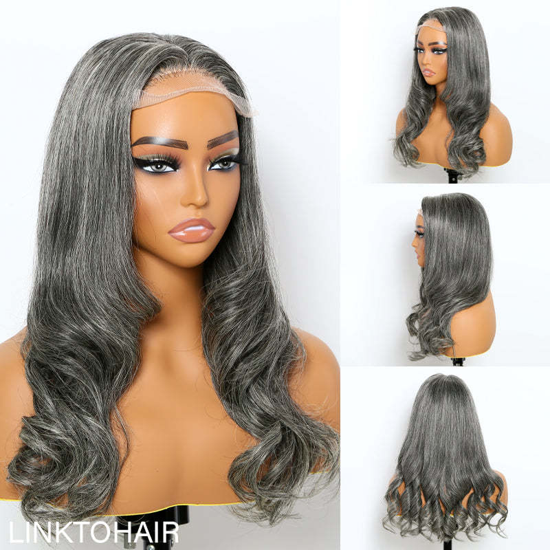 Salt & Pepper Layered Cut | Natural Wavy Curtain Bangs Hair 5x5 Lace Closure Wig
