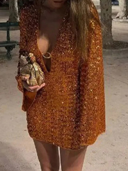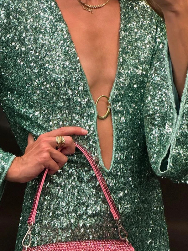 Shiny Sequinned Long Sleeves Hollow Mini Dresses