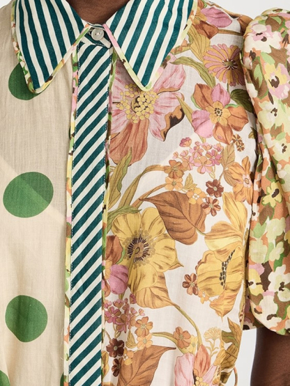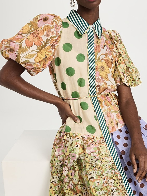 Short Sleeves Flower Print Patchwork Lapel Collar Maxi Dresses