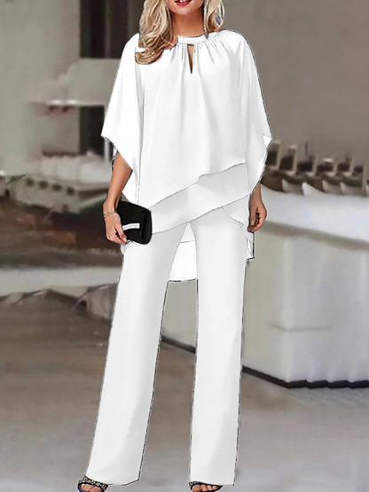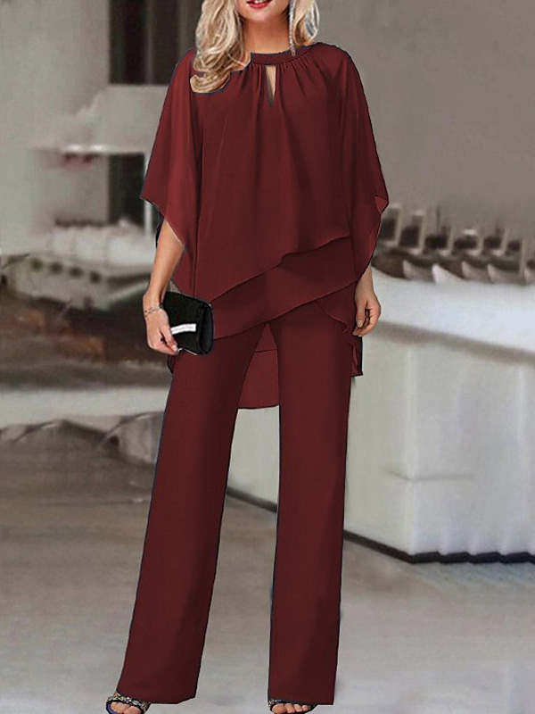 Solid Color Batwing Sleeves Shirt Tops & Pants Chiffon Two-Piece-Sets