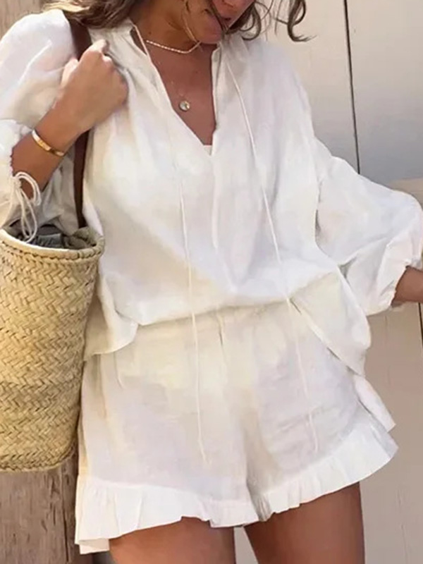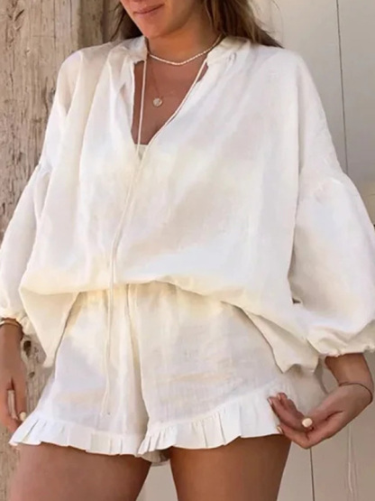 Solid Color Blouses Shirt Tops & Short Two-Piece Sets