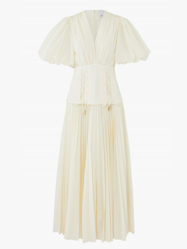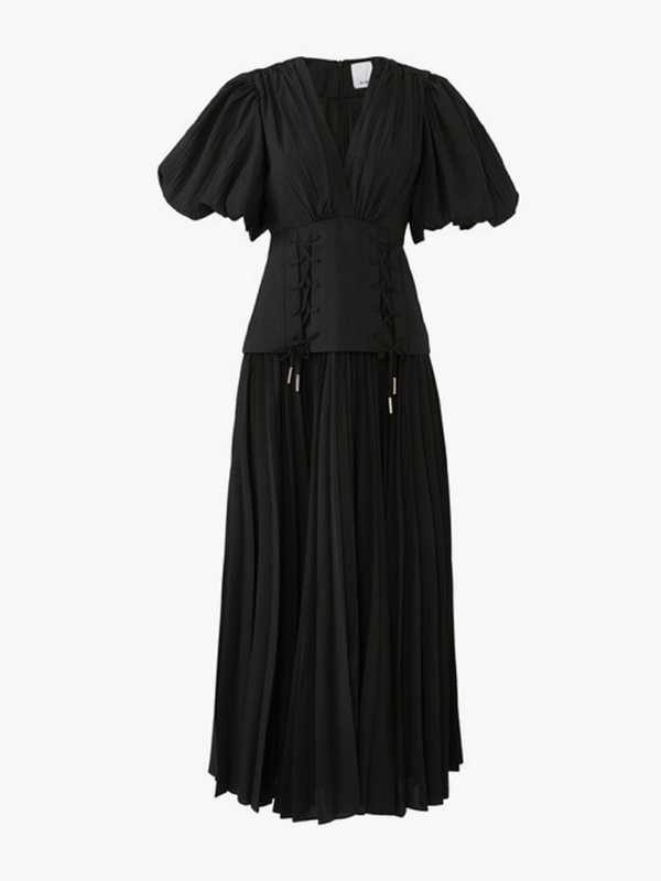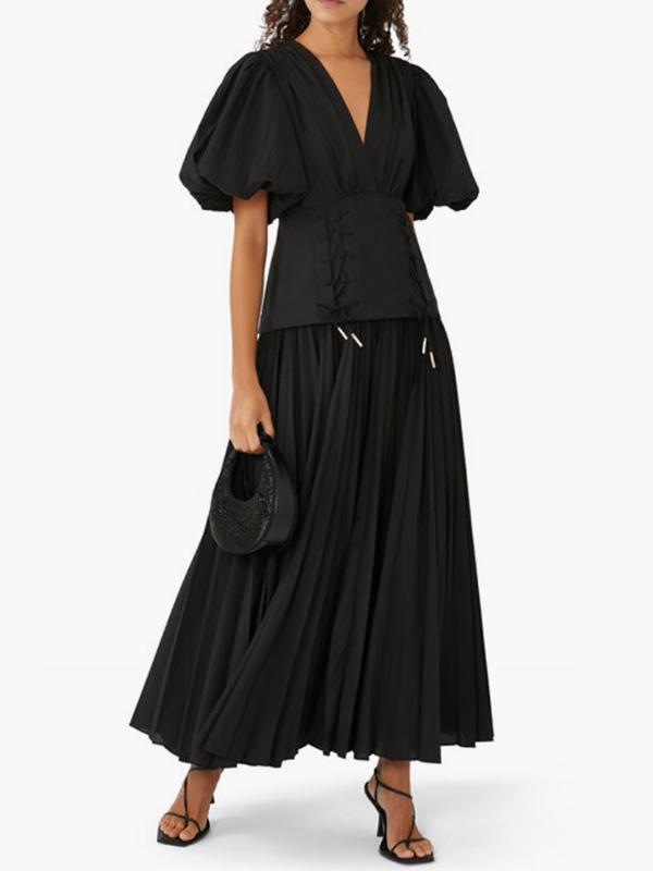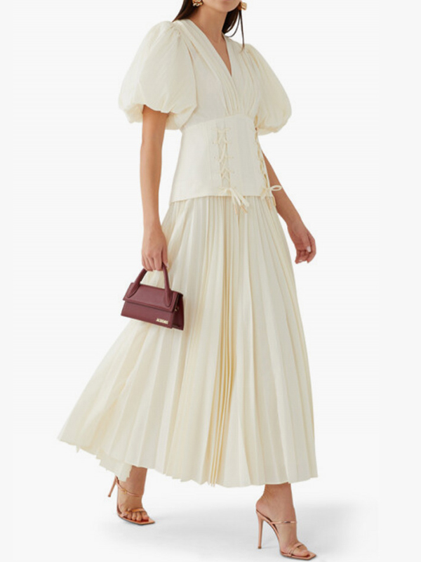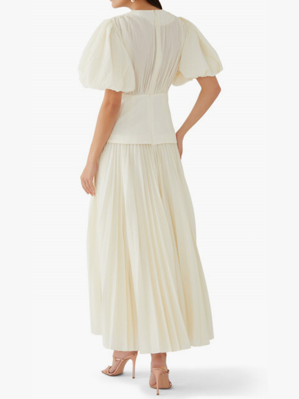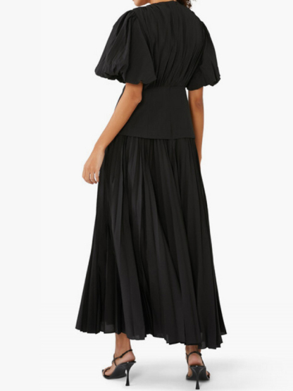 Solid Color Puff Sleeves Pleated High-Waisted Elegant Maxi Dresses