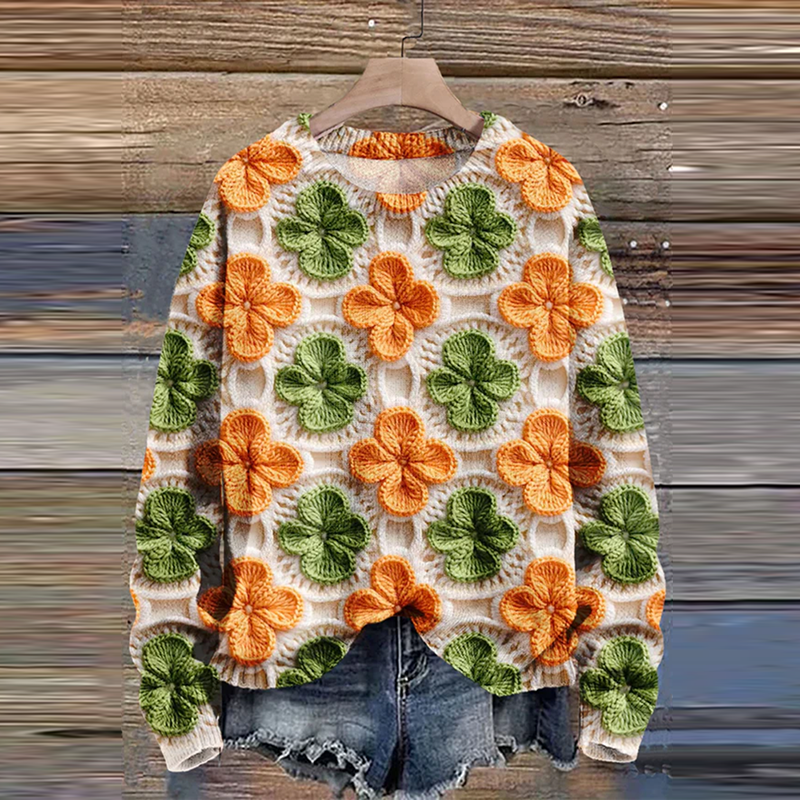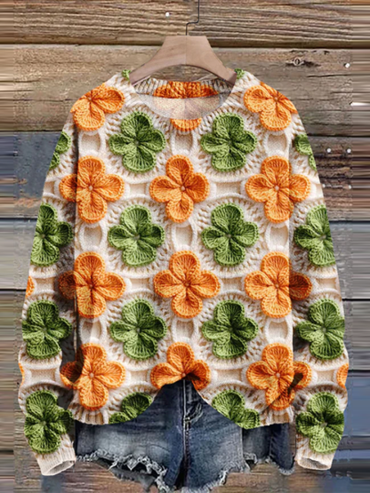 St. Patrick's Day 3 Leaf Clover Crochet Art Knitted Crew Neck Sweater