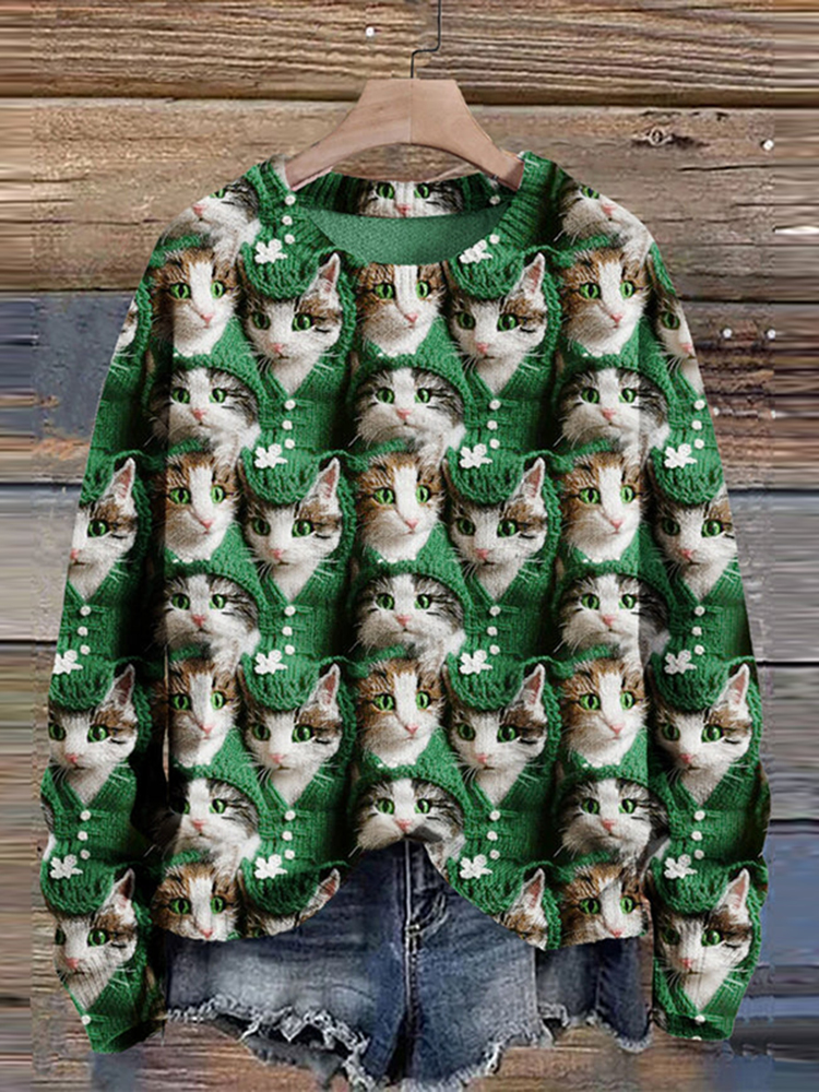 St. Patrick's Day Cat Art Print Knit Pullover Sweater