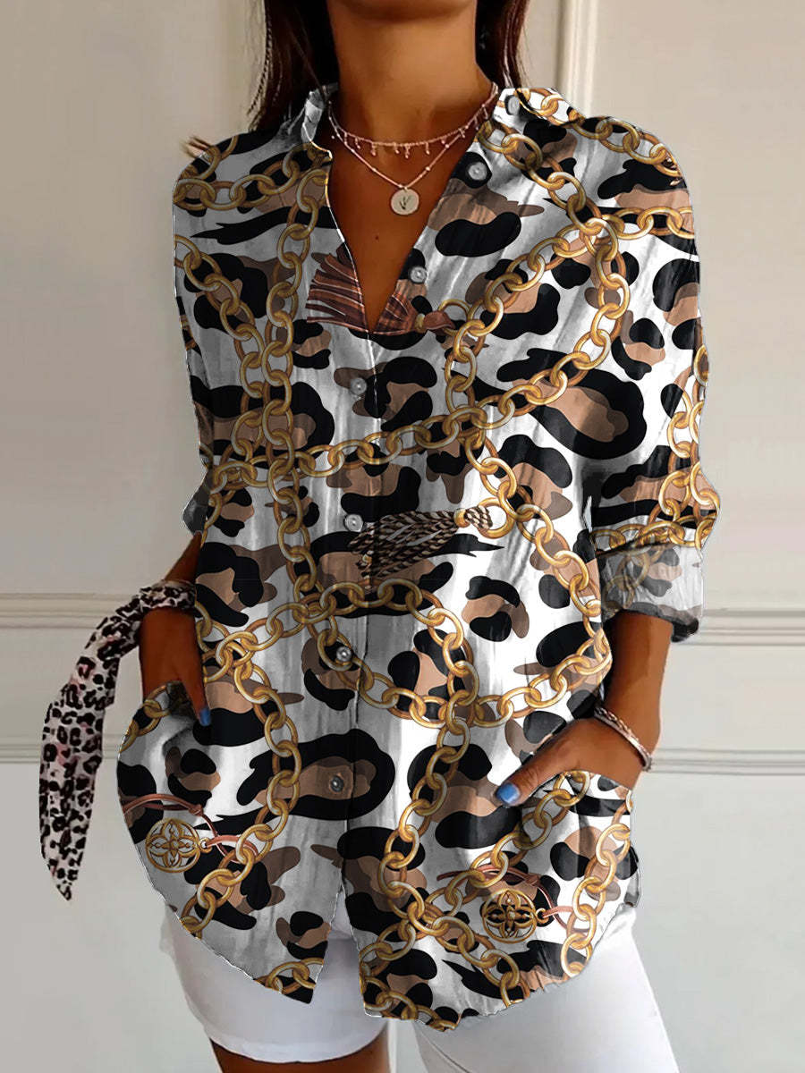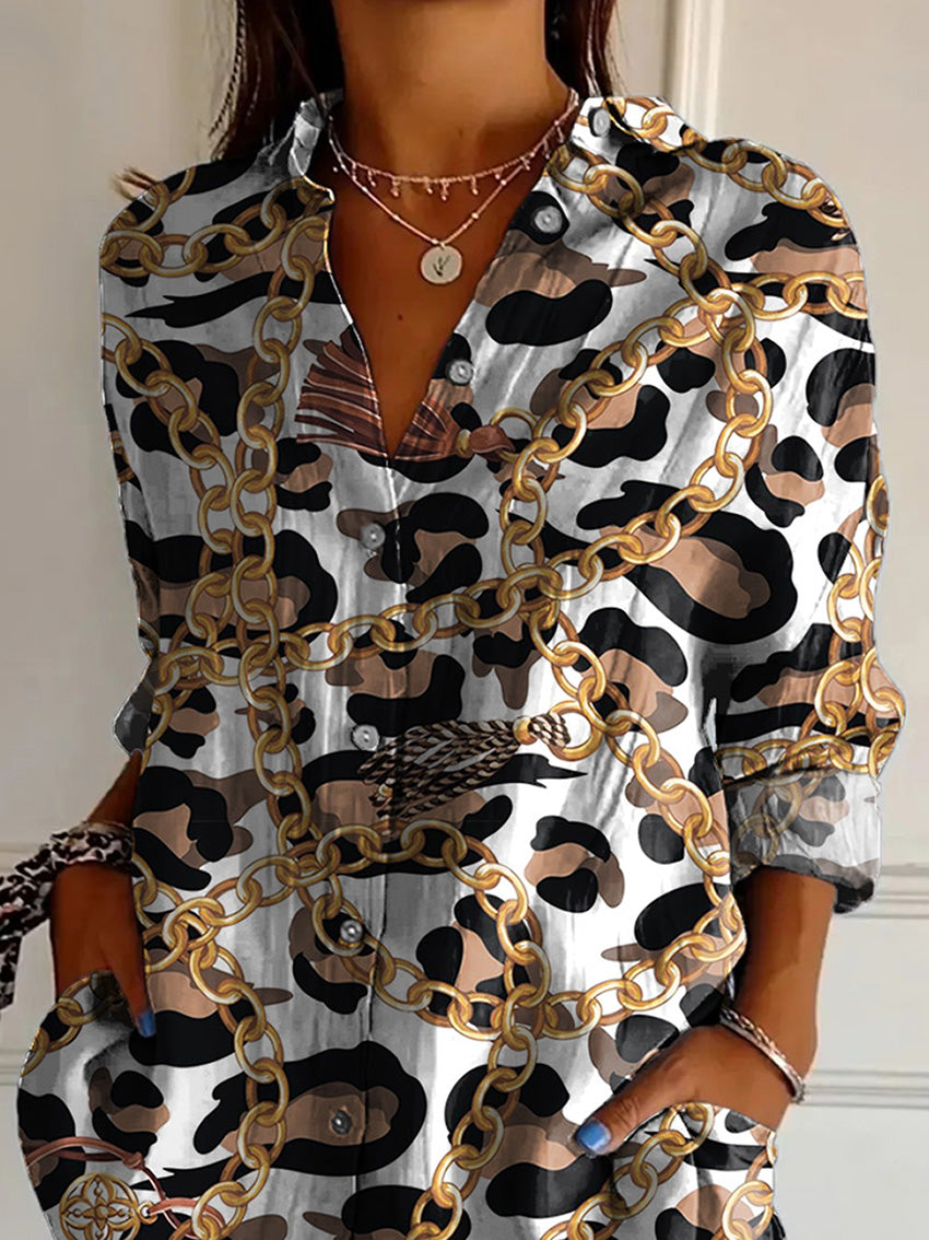 Stylish Gold Chain And Leopard Print Pattern Printed Women's Casual Cotton Shirt
