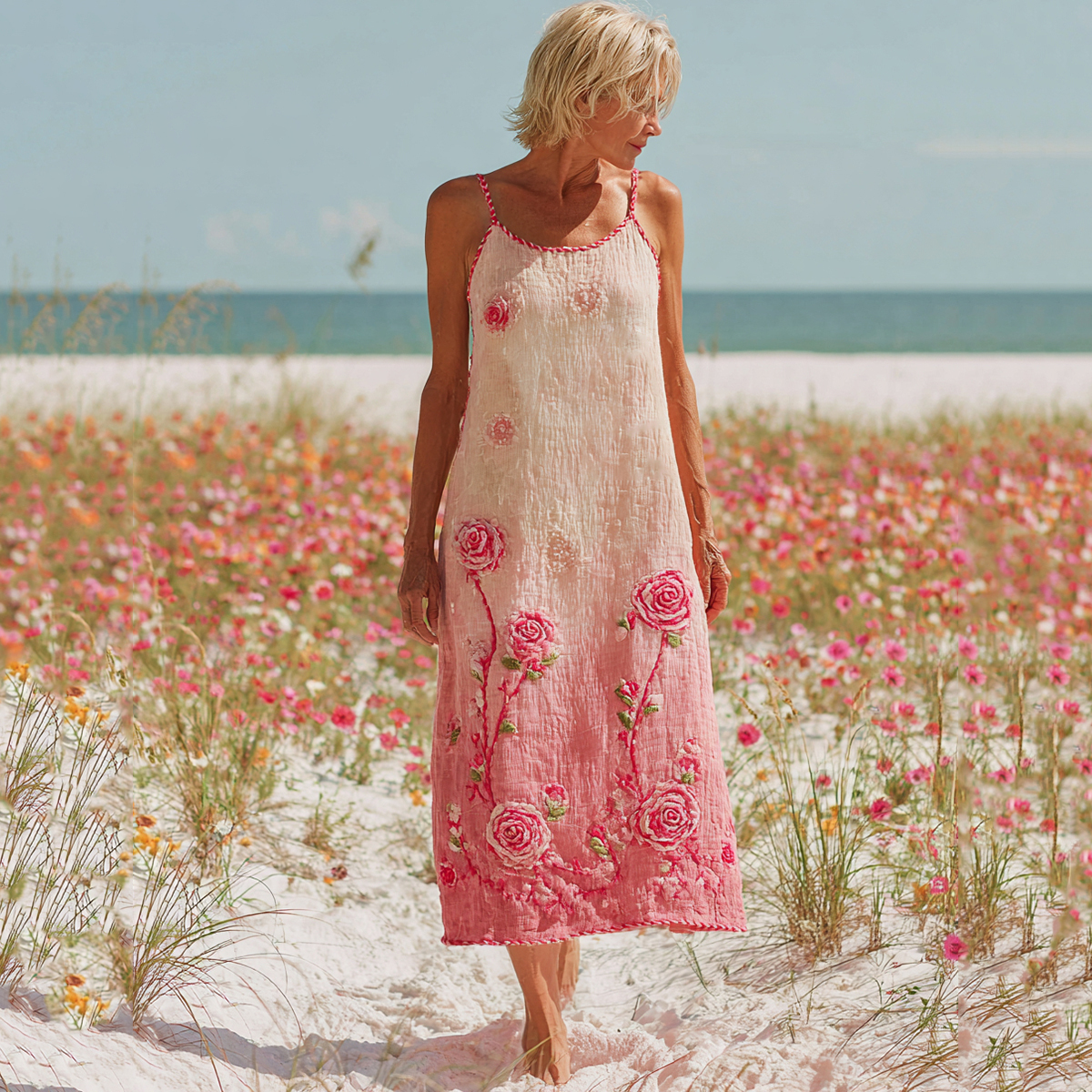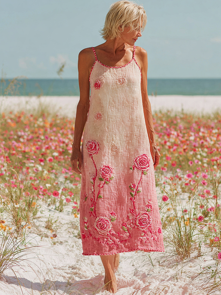 Stylish Pink Floral Embroidered Cozy Suspenders Maxi Dress