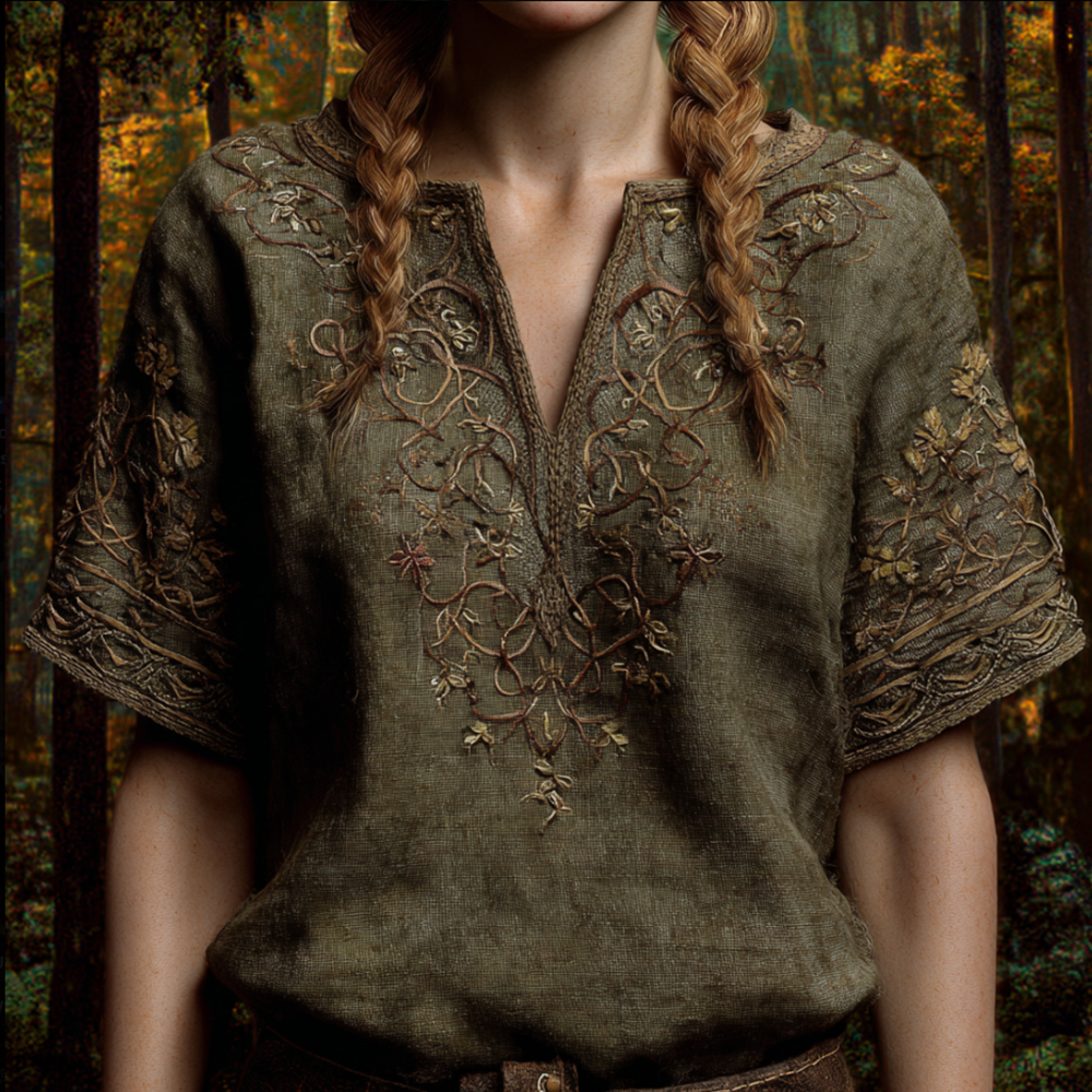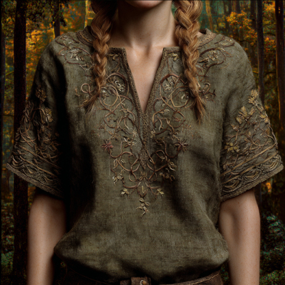 Viking Embroidery Small V-neck Short-sleeved Shirt