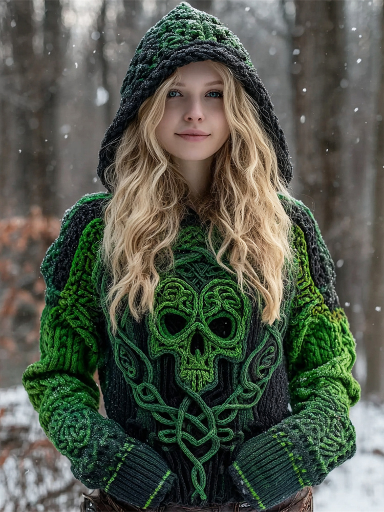Viking Skull Halloween Women's Hooded Chunky Knit Sweater