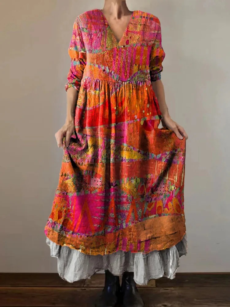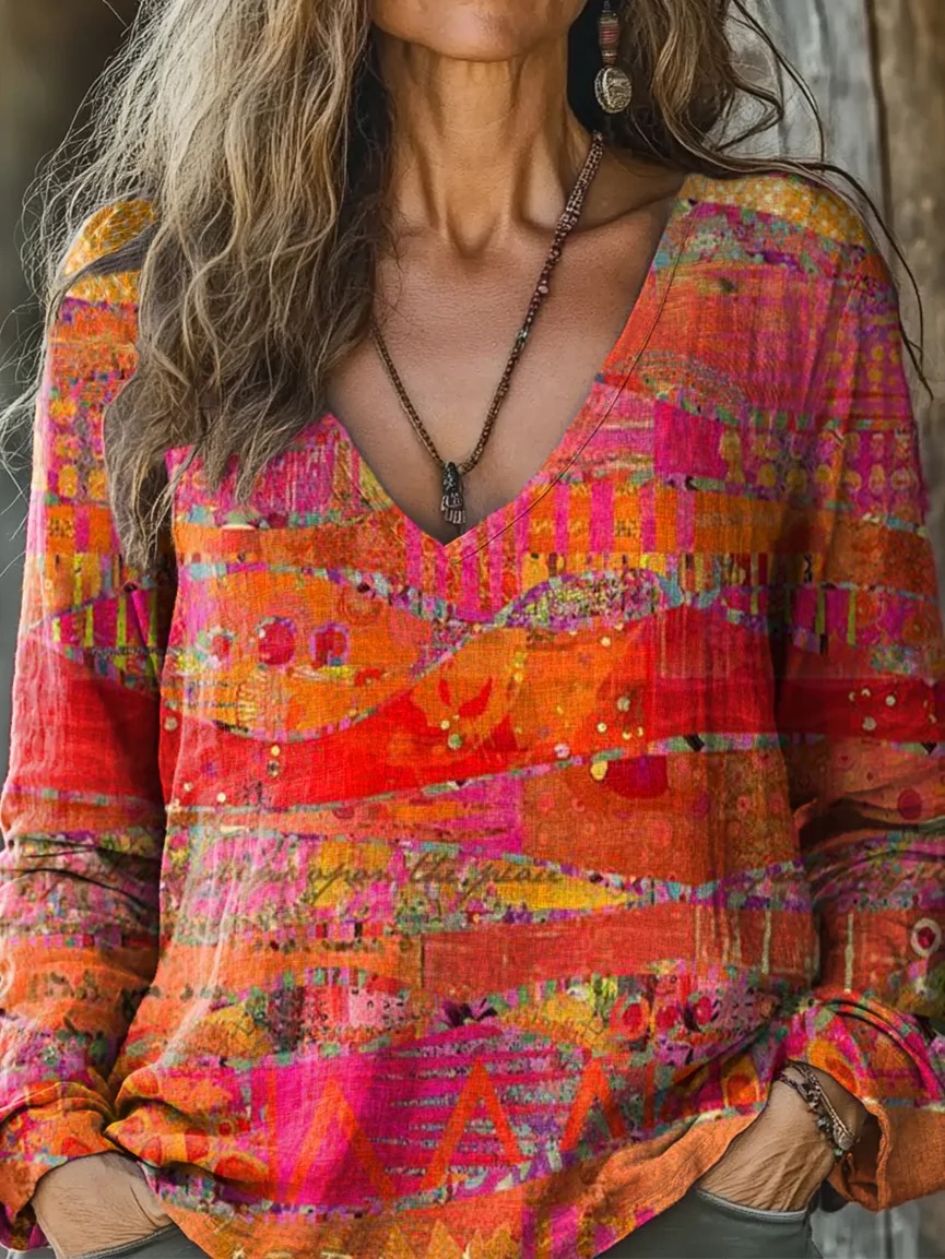Women's Abstract Ethnic Art Pattern Print Casual Cotton Linen Shirt