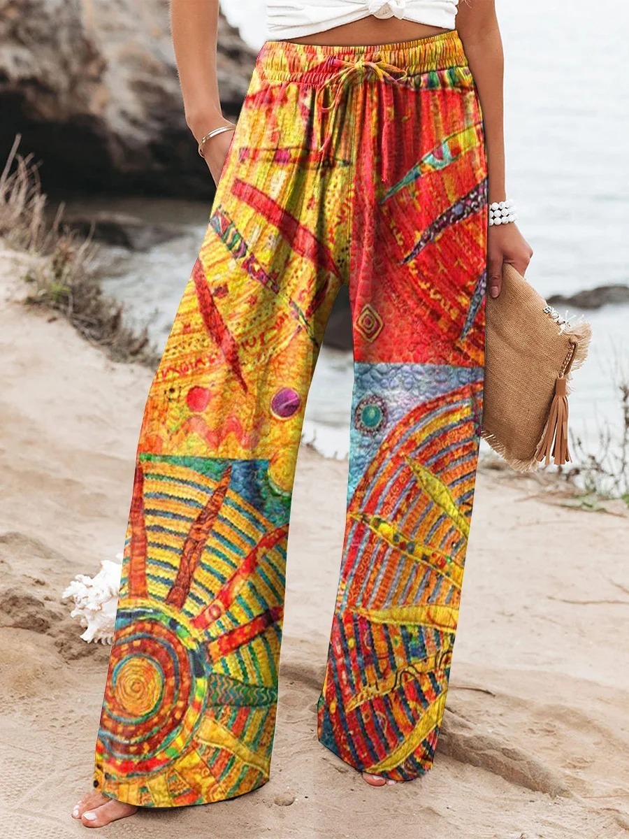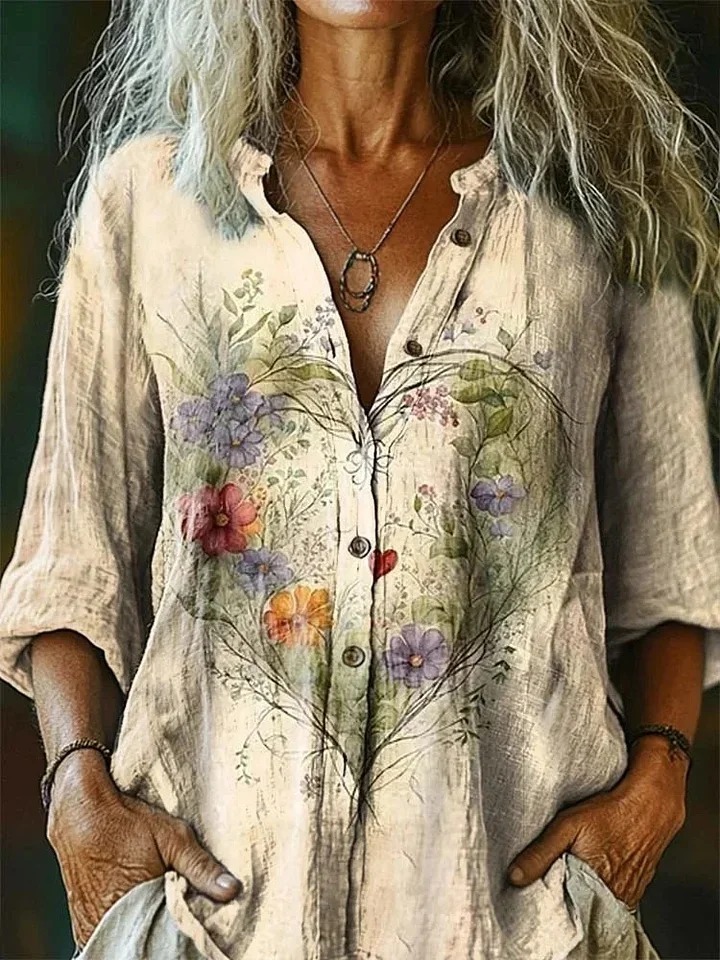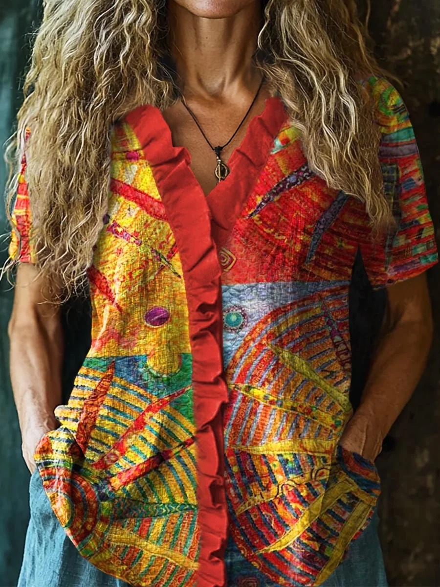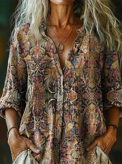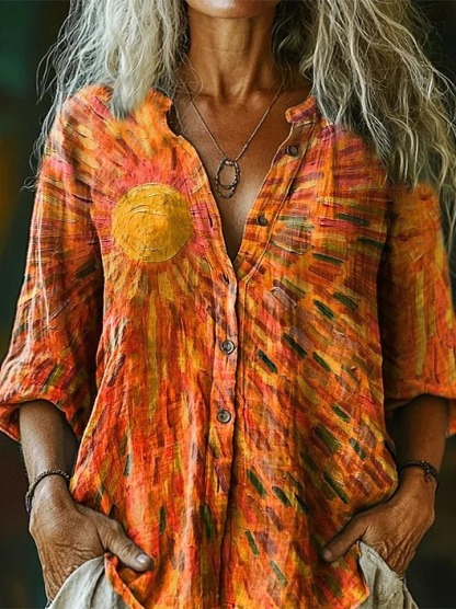 Women's Bohemian Sun Collage Art Pattern Print Casual Cotton Linen Shirt